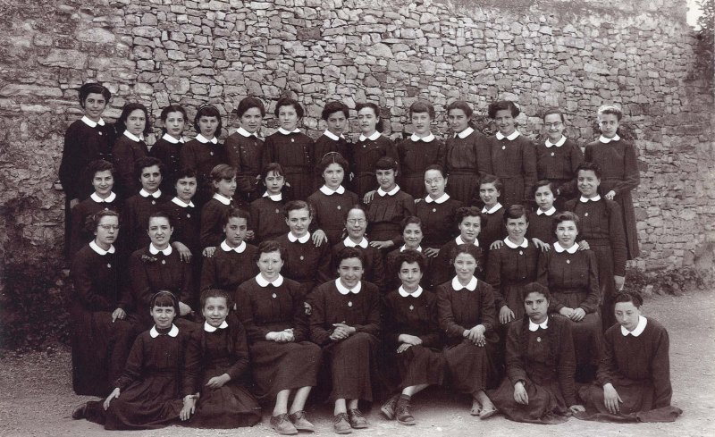 De nens també n’hi van passar molts per l’aula de parvulari del centre. Portaven les conegudes bates de ratlles que tots recordem. En aquesta fotografia feta el 22 d’agost de 1952 a la terrassa del col·legi hi trobareu moltes cares conegudes.