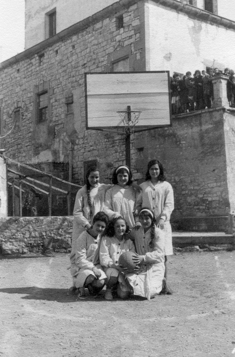 Grup d’alumnes al pati de bàsquet. Fixeu-vos que al darrera es veu el galliner. També podeu veure com un grup d’alumnes, des de la terrassa, miraven el partit.