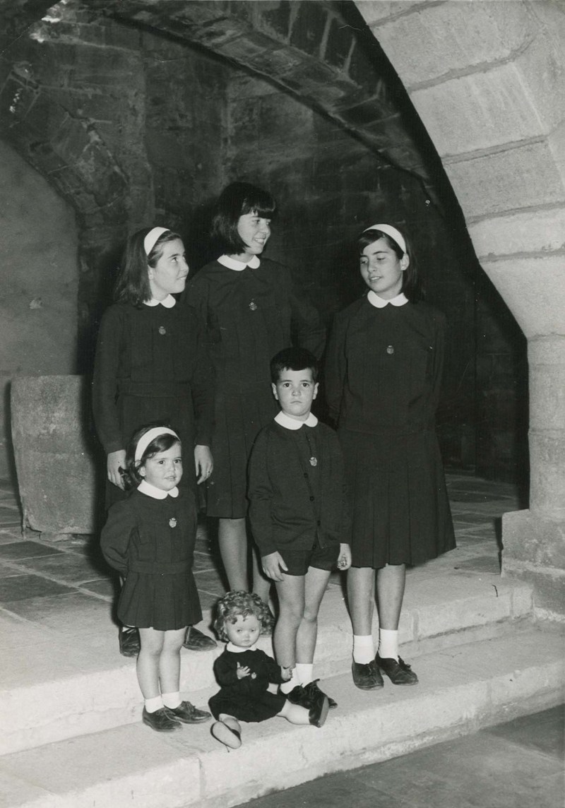 Van vestits amb l’uniforme, també la nina, de la Sagrada Família. La fotografia està feta als baixos de la Paeria, que està situada davant l’antiga casa familiar que, avui, resta tancada i deshabitada.