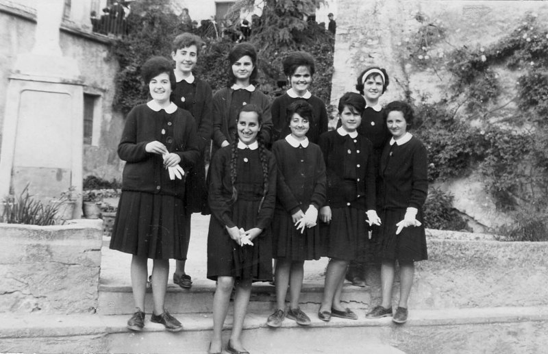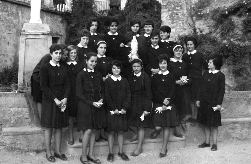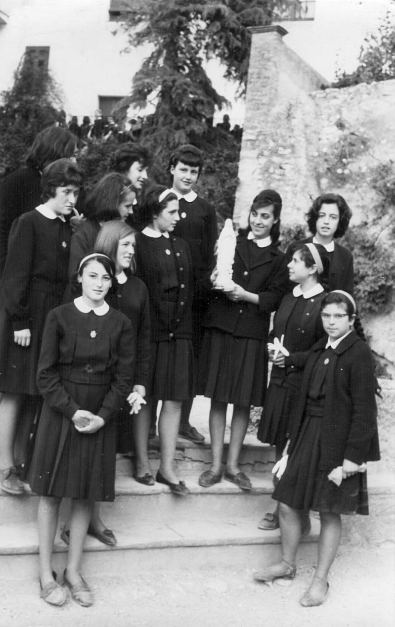 Amb el fotògraf a mà, hi havia qui demanava fotografies en petit grup. Totes porten al darrere imprés Gomez Grau, que és qui venia a fer-les. Després tothom passava per la botiga que tenien al carrer Major, on ara hi ha el Museu Comarcal, per encarregar els duplicats. Sent un dia de festa l’uniforme era obligatori. Els guants blancs, que donaven més elegància al conjunt, no hi faltaven. Portar els cabells llargs trenats amb una o dues cues també era molt habitual, tot i que aquestes alumnes adolescents, ja tenien 14 anys.