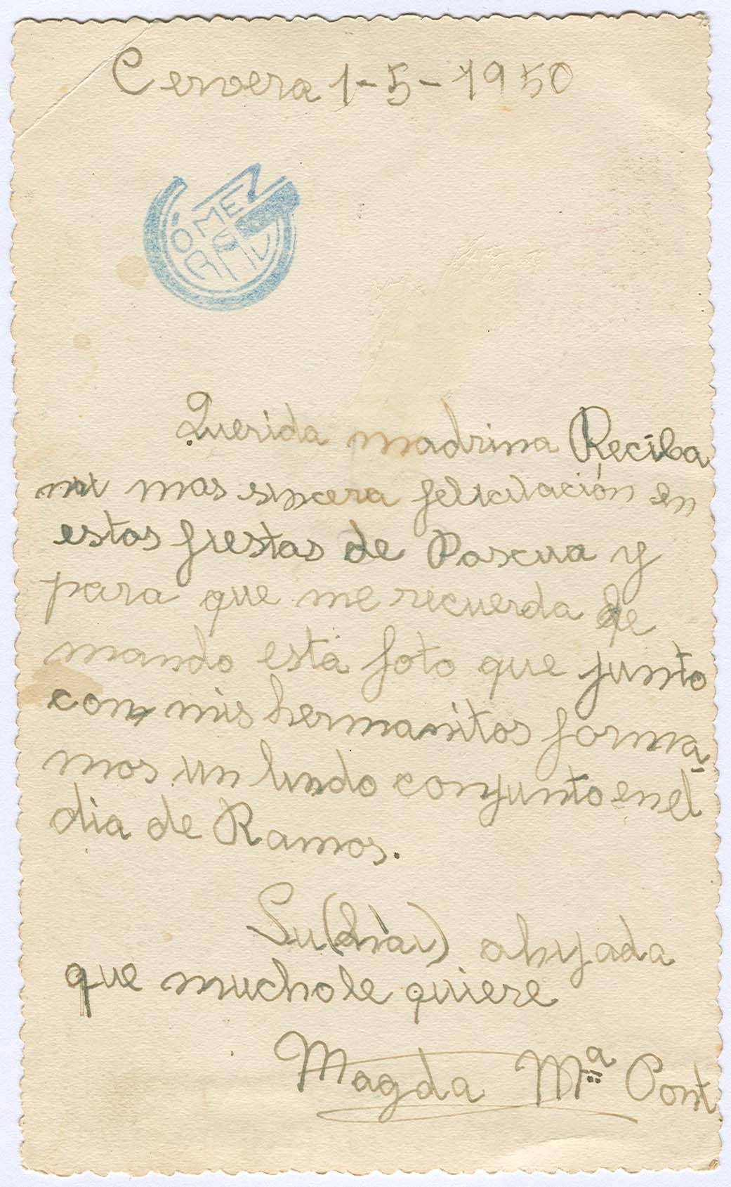 La nena que confirmaven és Antònia Hidalgo. L’escolanet podria ser Josep Raich. La padrina, que va molt mudada, és Dolors Razquin Fabregat.