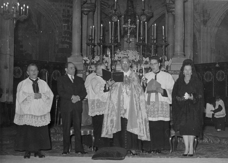 A l’esquerra podem veure el Rector de Cervera, mossèn Ramon Rota Canal. Al seu darrera hi ha el Vicari, un jove mossèn Josep Vilardaga i, tocant a l’altar, un capellà, molt alt i ja gran, mossèn Benet.
