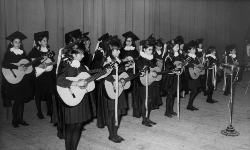 La tuna estava de moda. Aquest grup d’alumnes es llueixen tot i cantant i tocant la guitarra.