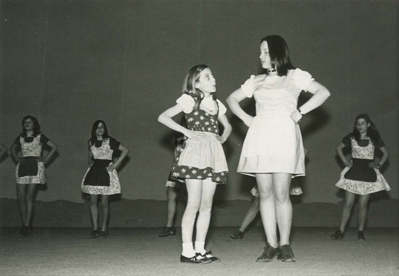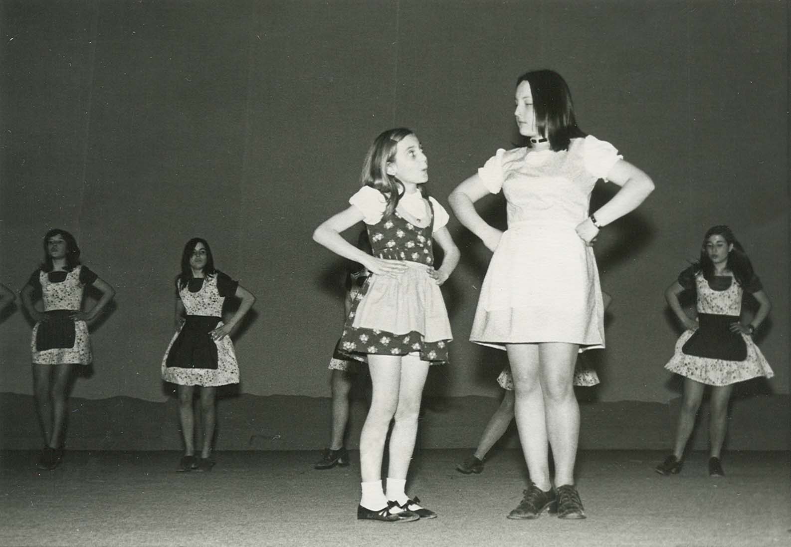 En aquesta fotografia, la noia gran, Esqué de cognom i que era interna,, interpretava a la jove cuidadora dels fills de la Família Trapp. La nena, alumna de 5è d’EGB, és Dolors Boquet Estruch que feia de filla petita d’aquesta famíla. Com podeu veure el vestuari de caire tirolés estava molt ben aconseguit. La cancó que es va triar era molt alegre i la interpretació va ser molt aplaudida.