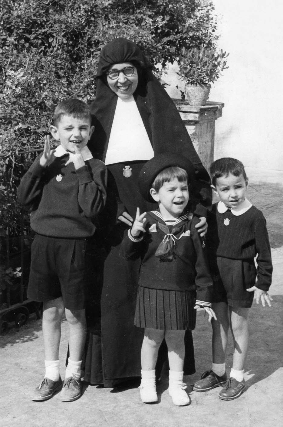 Entranyable imatge dels germans Xandri i un cosí seu amb una tieta del seu pare, filla de Cervera i monja de la Sagrada Família. Aquí es veu molt bé l’hàbit que portaven, especialment aquesta mena de cosa incòmoda que els tapava el cap i les espatlles i només els deixava la cara a la vista. Els nens porten l’uniforme de la Sagrada Família i la nena va de carrer.