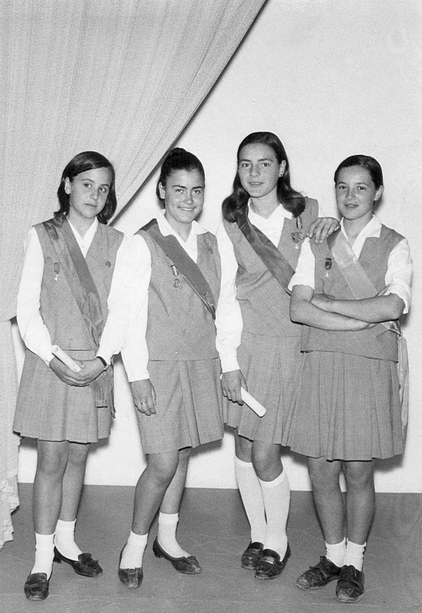 Havíem vist algunes fotografies amb les alumnes portant bandes però sempre anaven amb l’uniforme de tota la vida. Aquesta imatge testimonia que es seguien posant bandes en els darrers temps quan ja s’havia canviat l’uniforme.