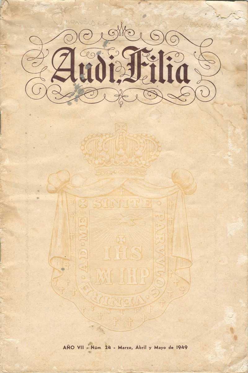 “Audi, Filia” és el nom d’una publicació del Col·legis de la Sagrada Família. Com podeu veure, el rètol està fet amb unes lletres gòtiques ben boniques i, a sota, s’hi troba el dibuix de l’escut de la Sagrada Família. S’editava trimestralment i aquest exemplar és el número 24 corresponent als mesos de març, abril i maig de 1949.