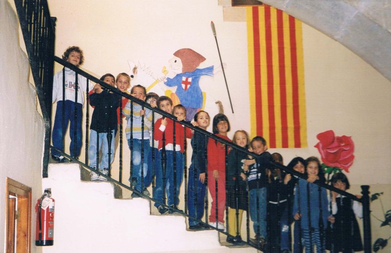 Sant Jordi i la rosa acompanyen la senyera. Fixeu-vos on està feta aquesta fotografia. L’escala de pedra i a barana de ferro la recordarà tothom perquè hi és de tota la vida. Quan feia mal temps, el pati es feia en l’espai al que s’hi accedeix per aquesta escala.