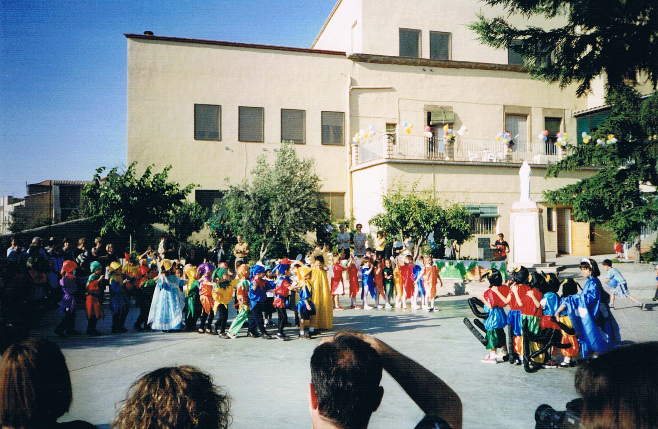 Any 1999. En aquestes dues fotografies del Festival de fi de curs es pot apreciar molt bé els canvis arquitectònics fets al col·legi. Aquest anexe que hi ha a l’esquerra és una part nova afegida a l’edificació.