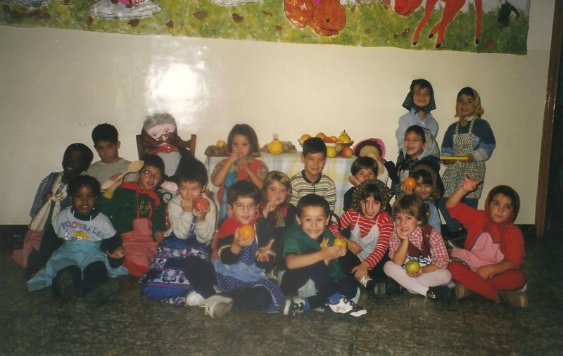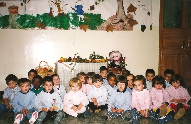 Any 1999. Castanyada. El mural de tardor ha canviat respecte al del curs anterior i la taula, amb unes estovalles diferents, té la mateixa funció. Sembla que és el dia de la celebració ja que les nenes van disfressades de castanyeres.