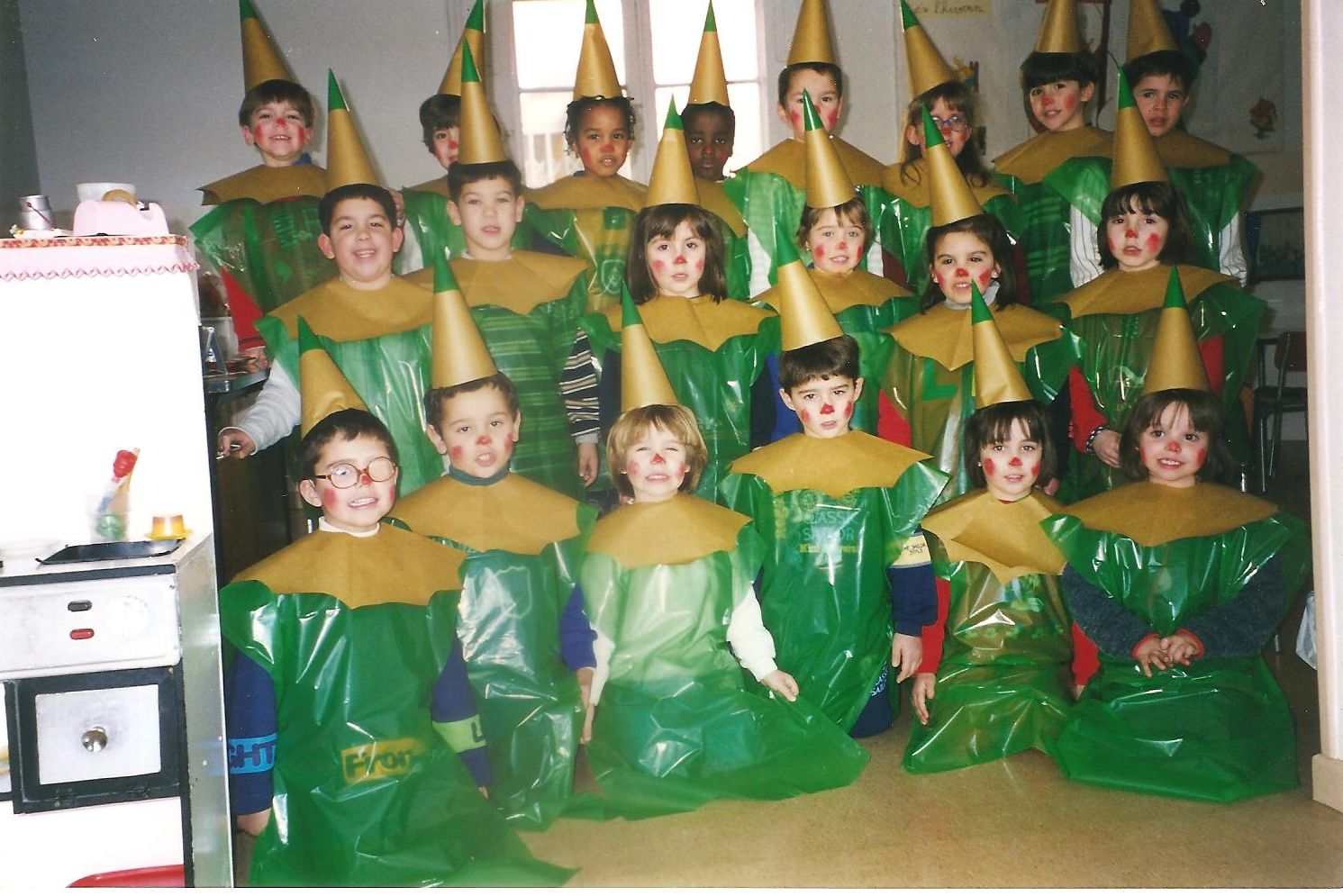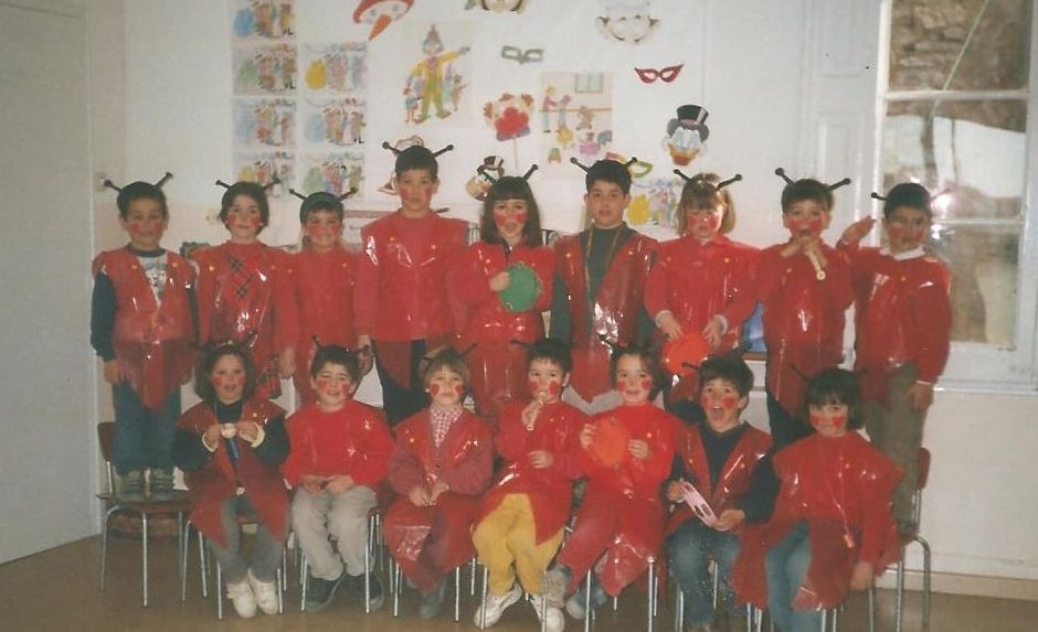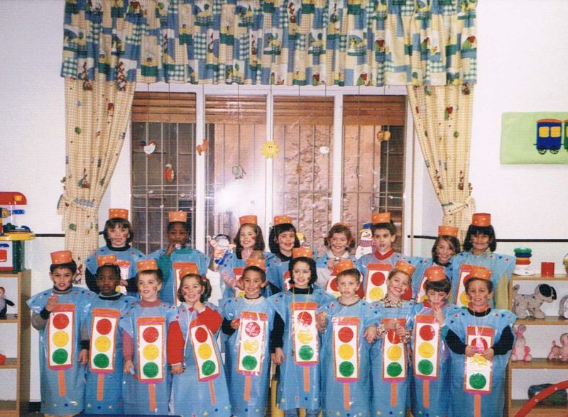 Any 1998. Festa de Carnestoltes. Uns simpàtics semàfors posen a la seva classe que, com podeu veure, fa molt goig amb aquestes cortines que semblen casolanes.