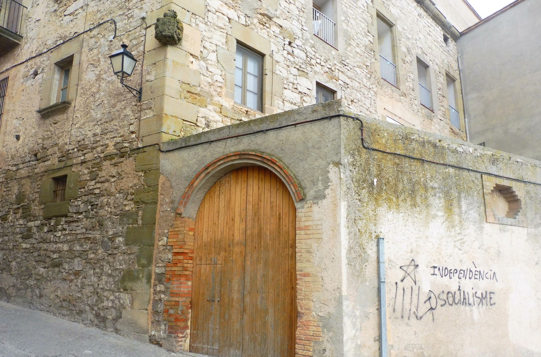 A la cantonada, també fet amb pedra, s’hi troba l‘escut del marquès de Capmany.