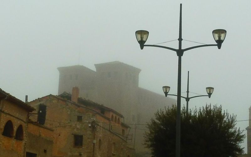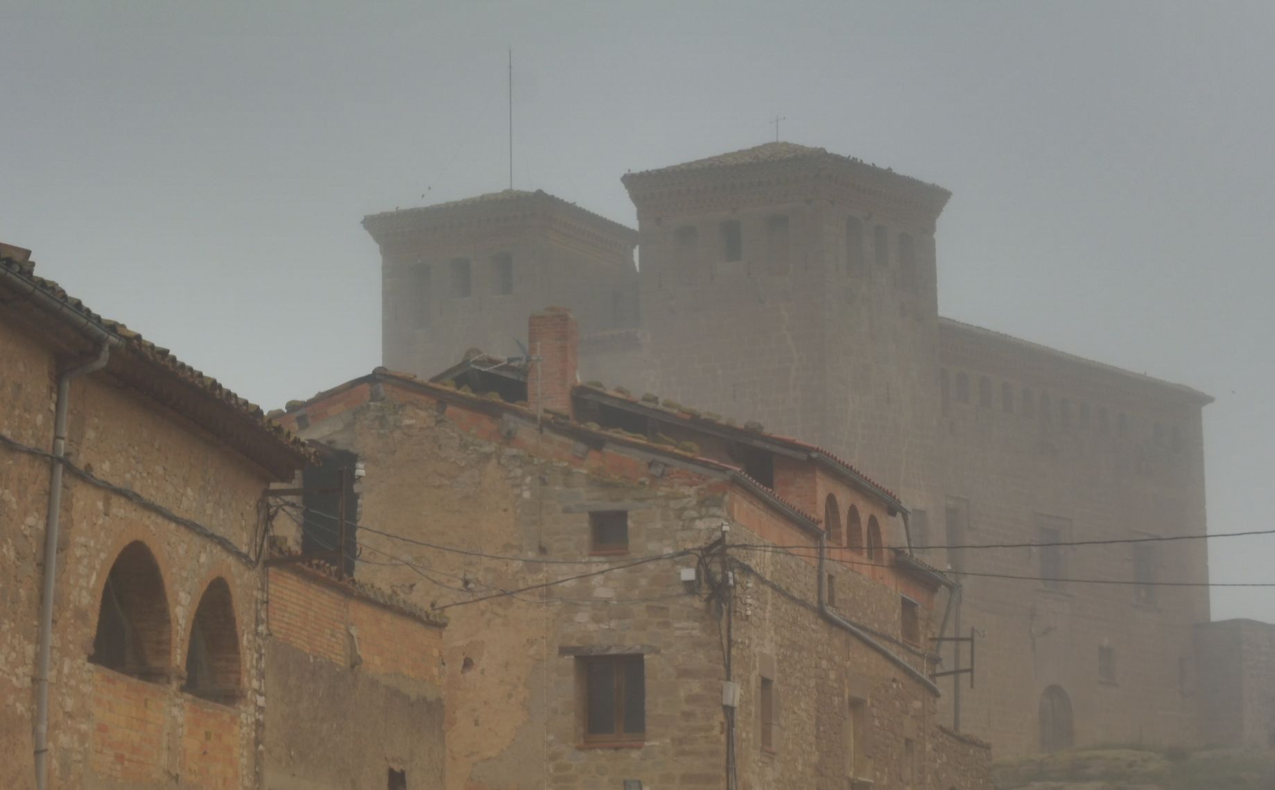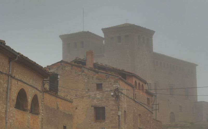 Montcortés ofereix la típica imatge de la boira segarrenca. El castell, al fons, queda desdibuixat.