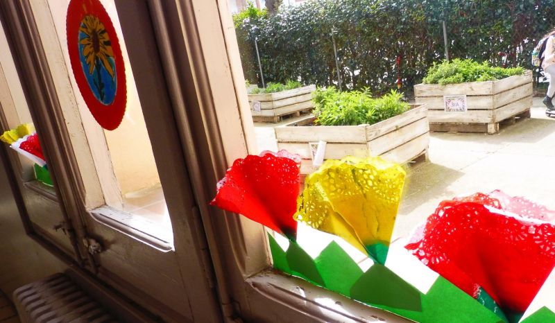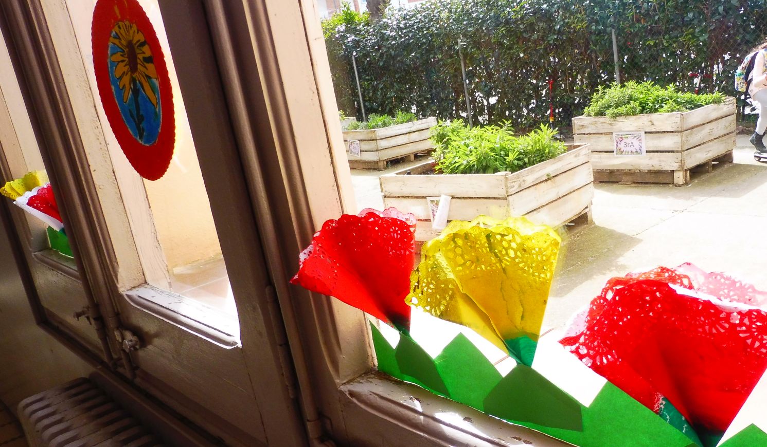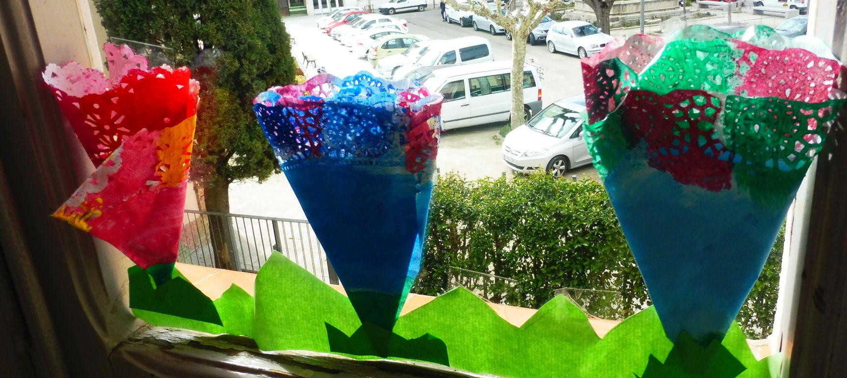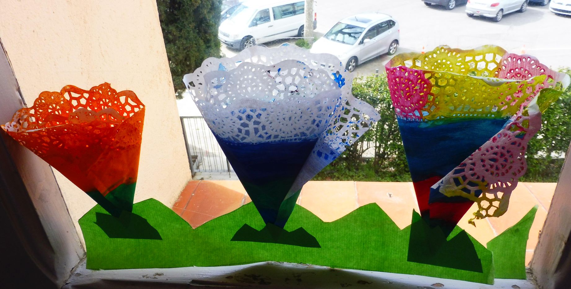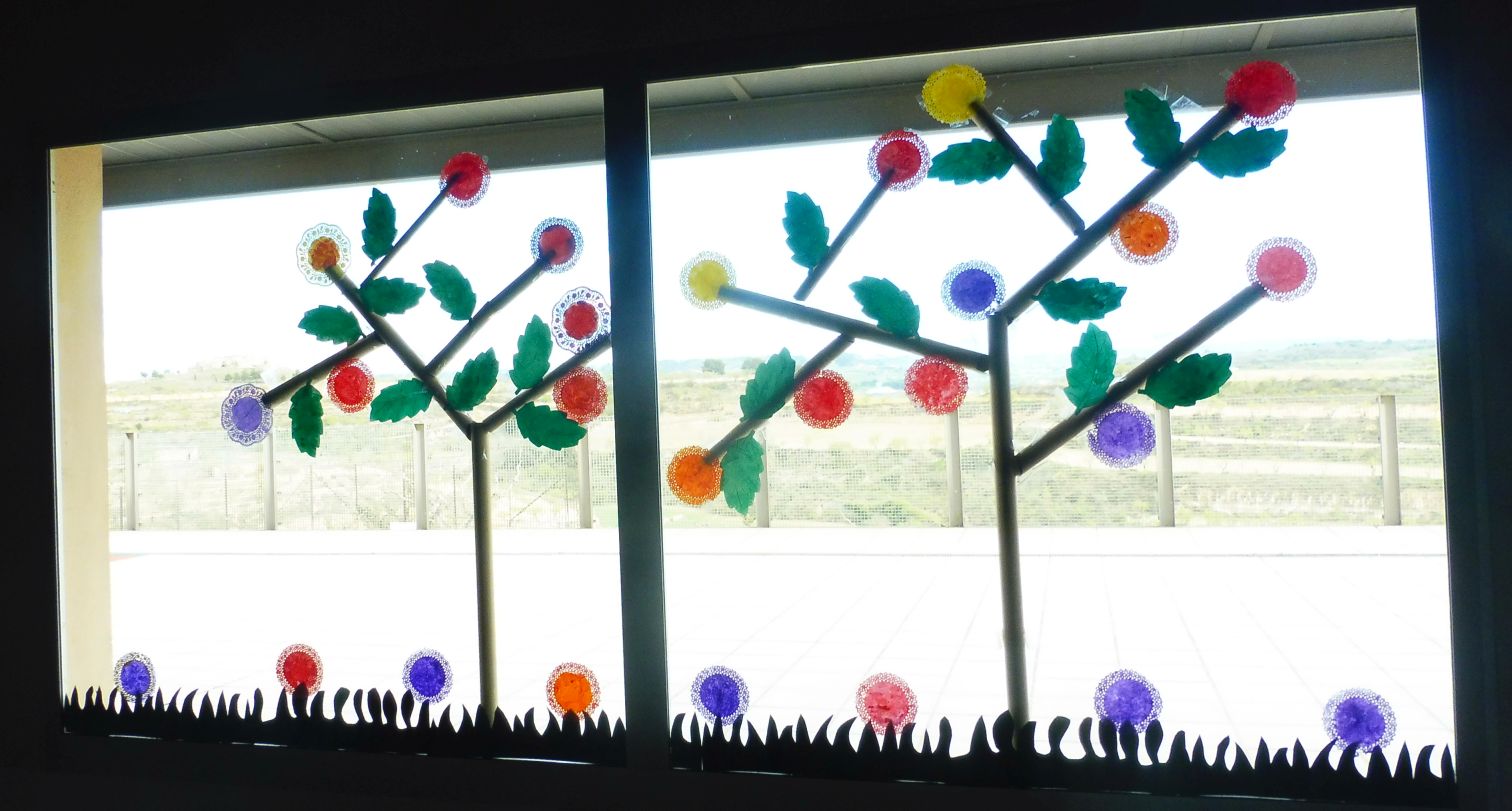 La Comissió de festes és qui sempre ha tingut cura de pensar què cal fer i de traslladar el projecte a la resta de professors del centre per tal de que, els i les alumnes, hi col·laborin el màxim possible. Pel que fa a aquesta primavera, que se’ns amaga i ens remulla sense treva, s’ha escollit com element decoratiu els típics tapetes de paper rodons que fan servir les pastisseries. Com que es comercialitzen en color blanc els han pintat de colors i, al doblegar-los, s’han convertit en flors, com podeu veure en aquestes properes fotografies.