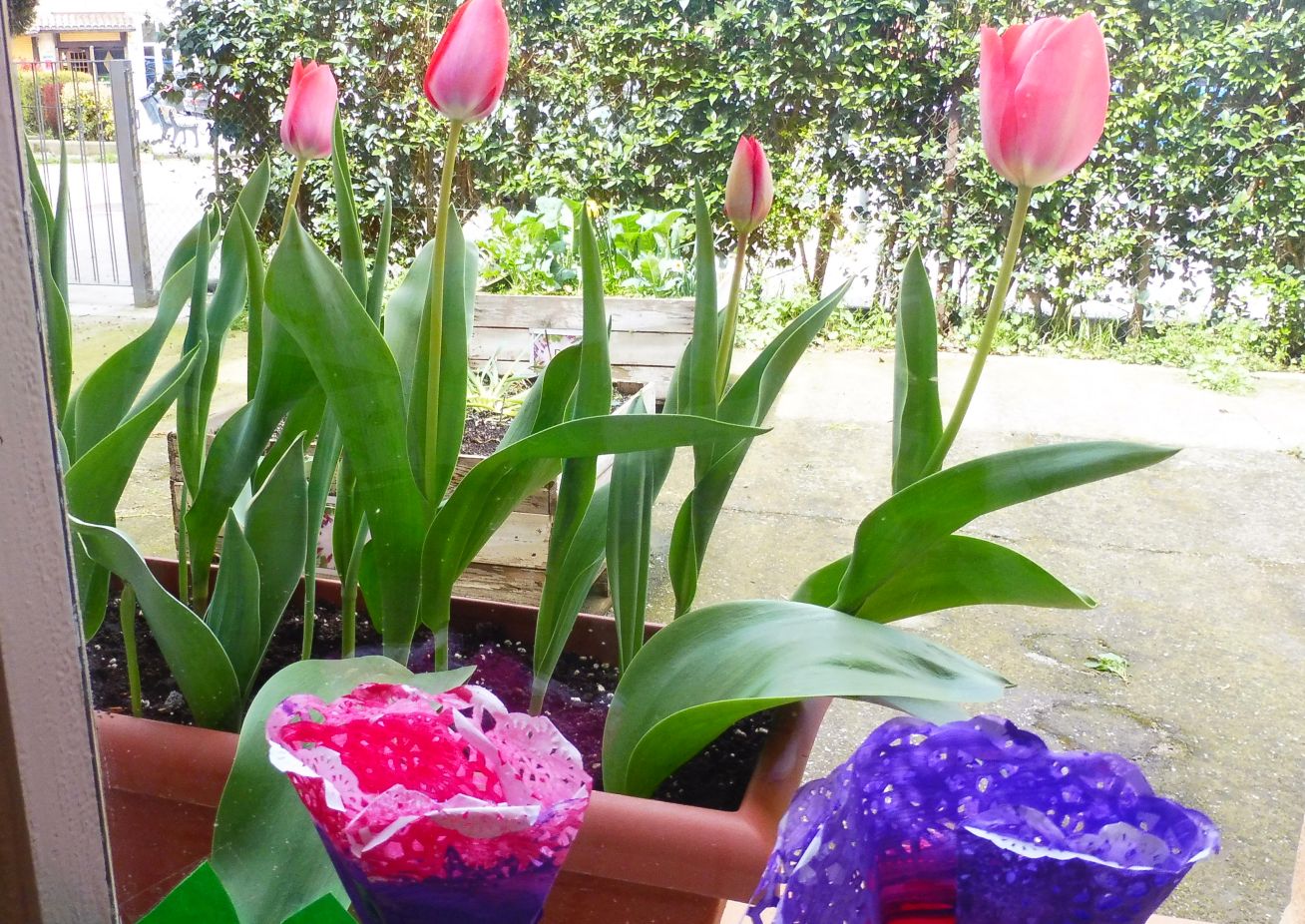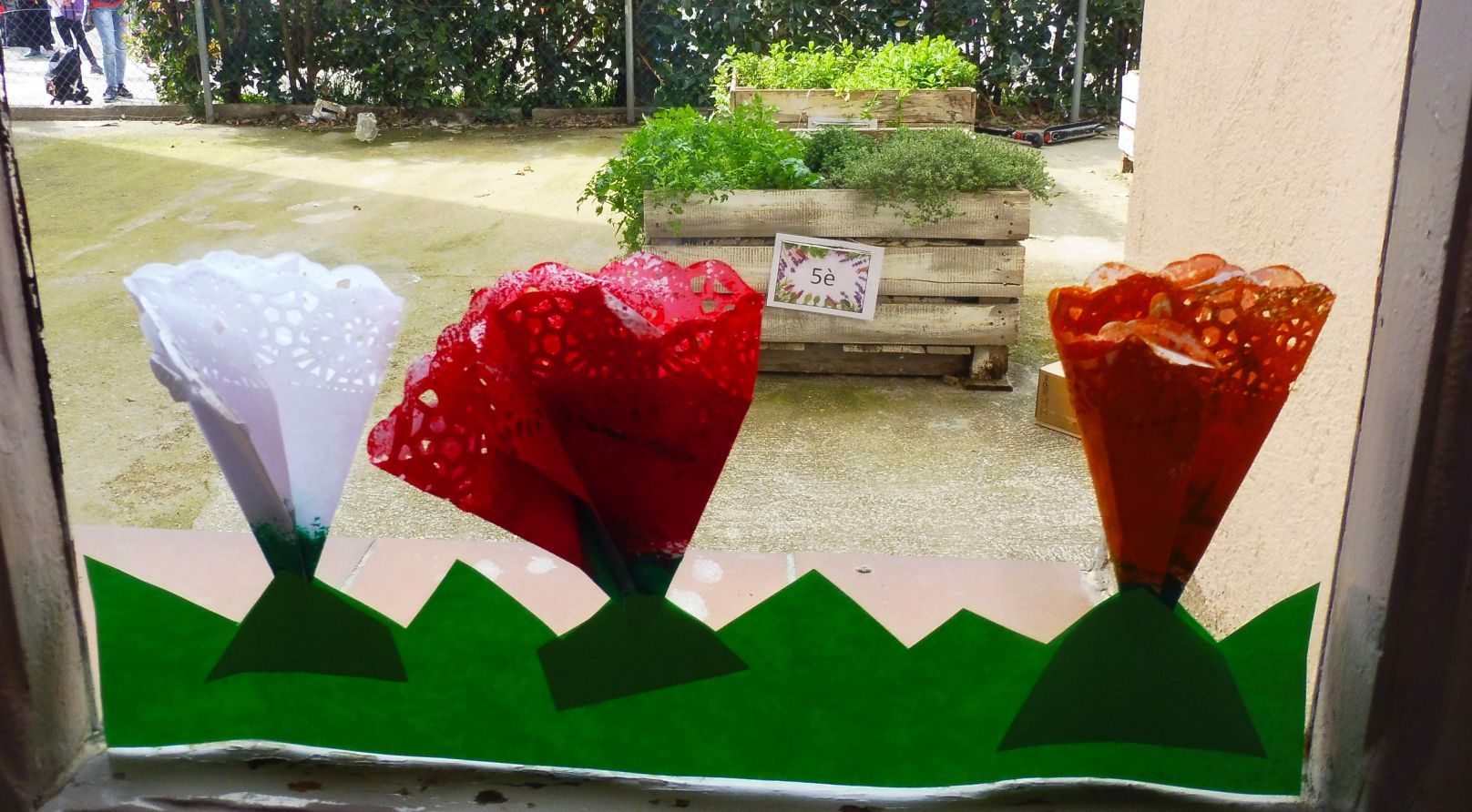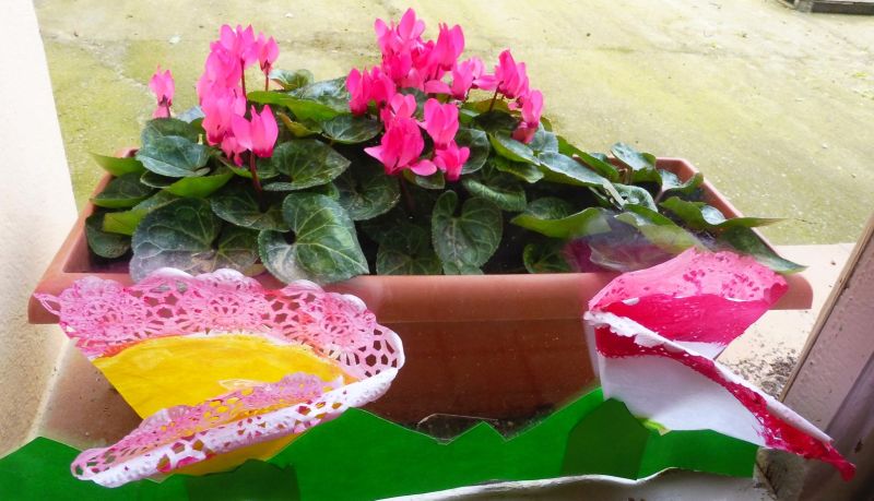 Aquestes flors de paper, barrejades amb les flors naturals que han plantat, i que ja han florit, encara fan més goig.