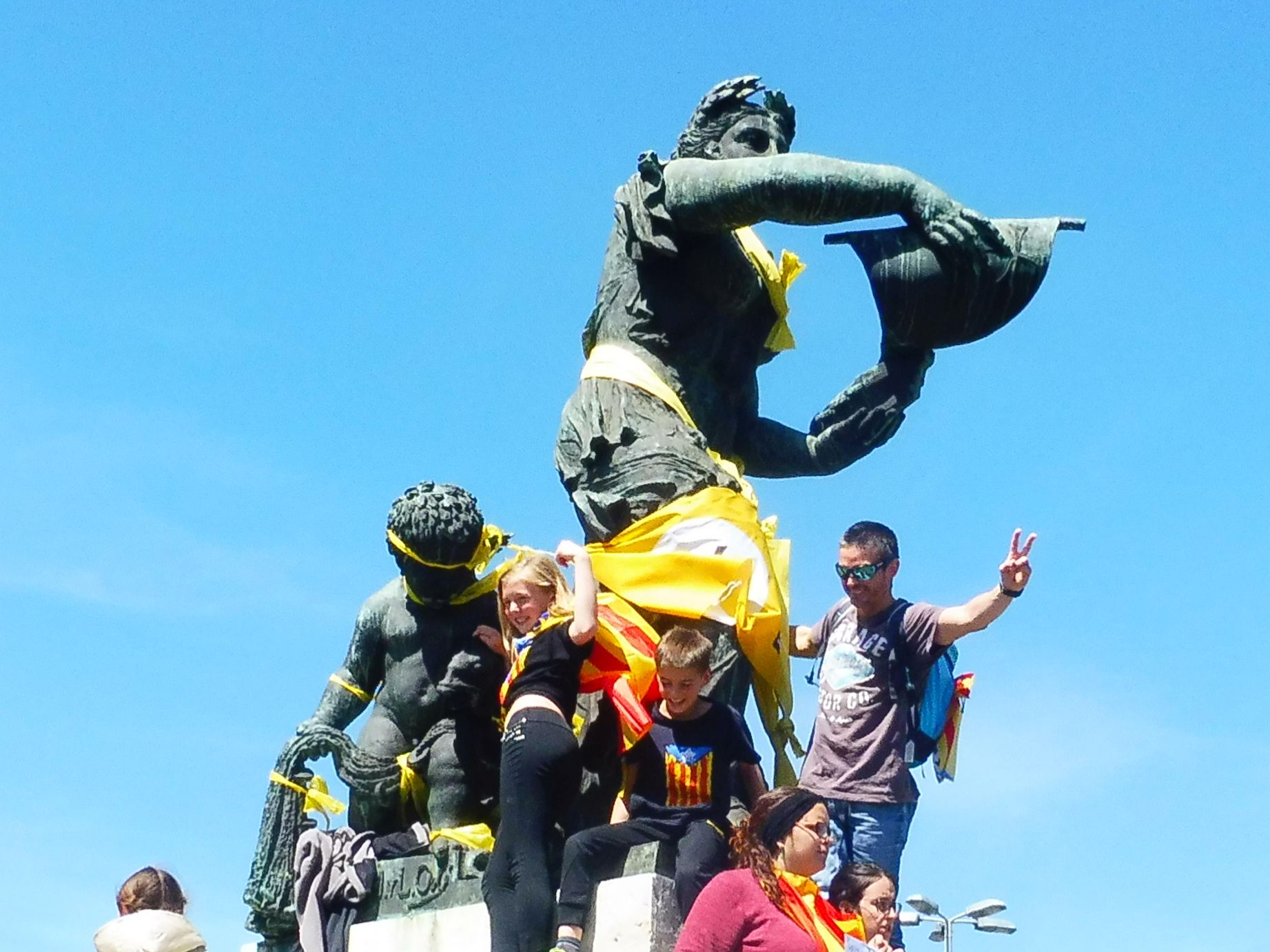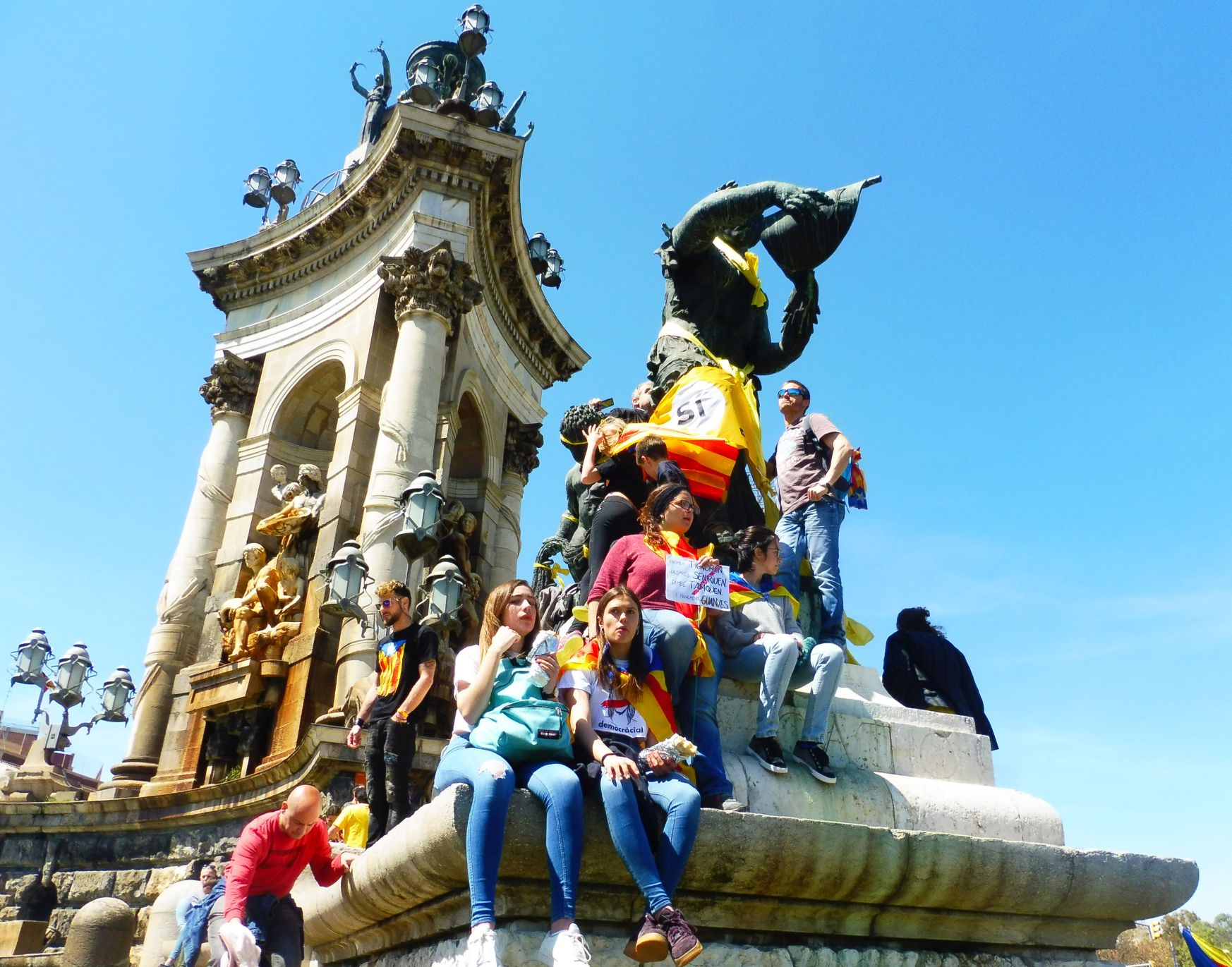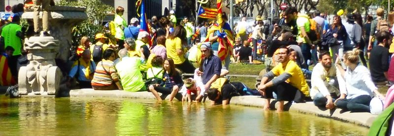 Mai l’havíem vist, en ple dia, buida de cotxes i amb els jardins i fonts que hi ha al centre plens de gent. Per tant, aquestes imatges són per tenir-les guardades a la memòria d’un dia especial que va permetre fer-les. El temps, que tant esplèndid va ser, va ajudar a fer que l’ambient, a més de revindicatiu, fos festiu i pacífic tot i la gentada que es va amuntegar aquí.