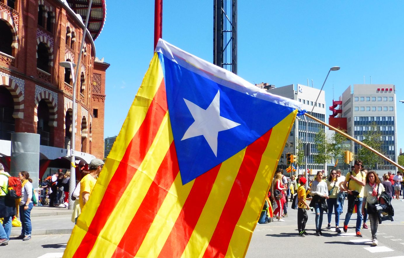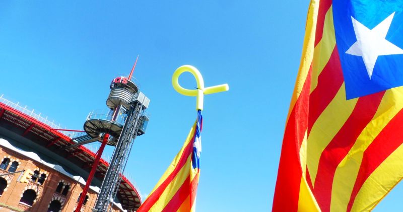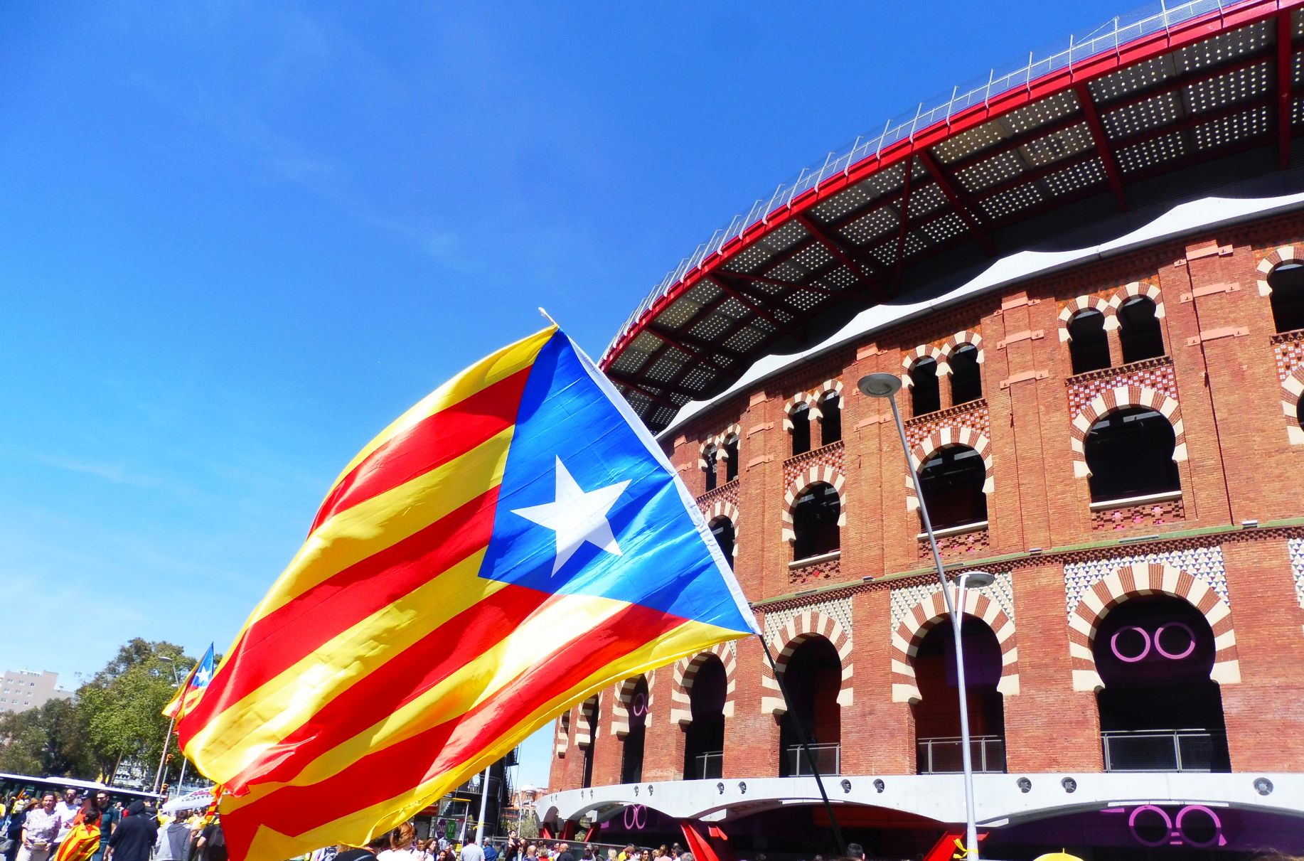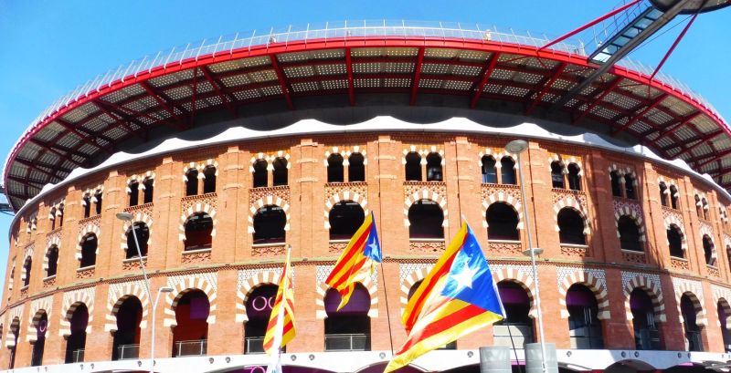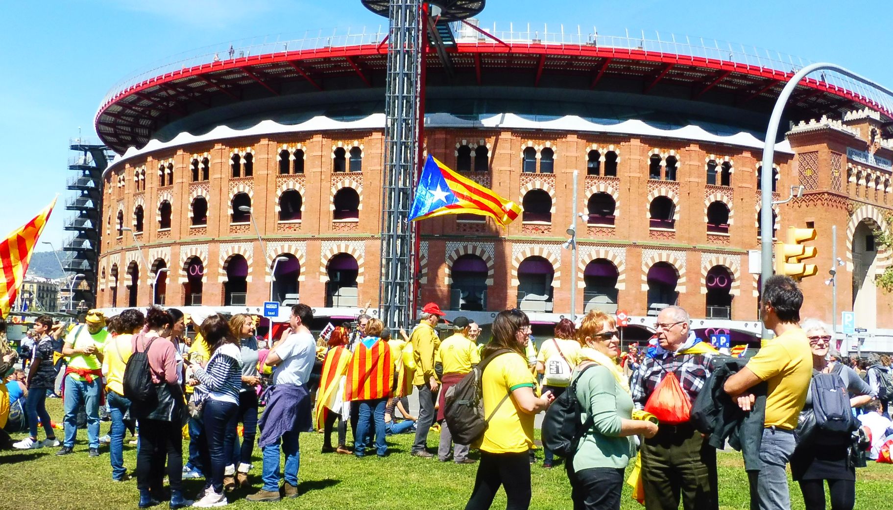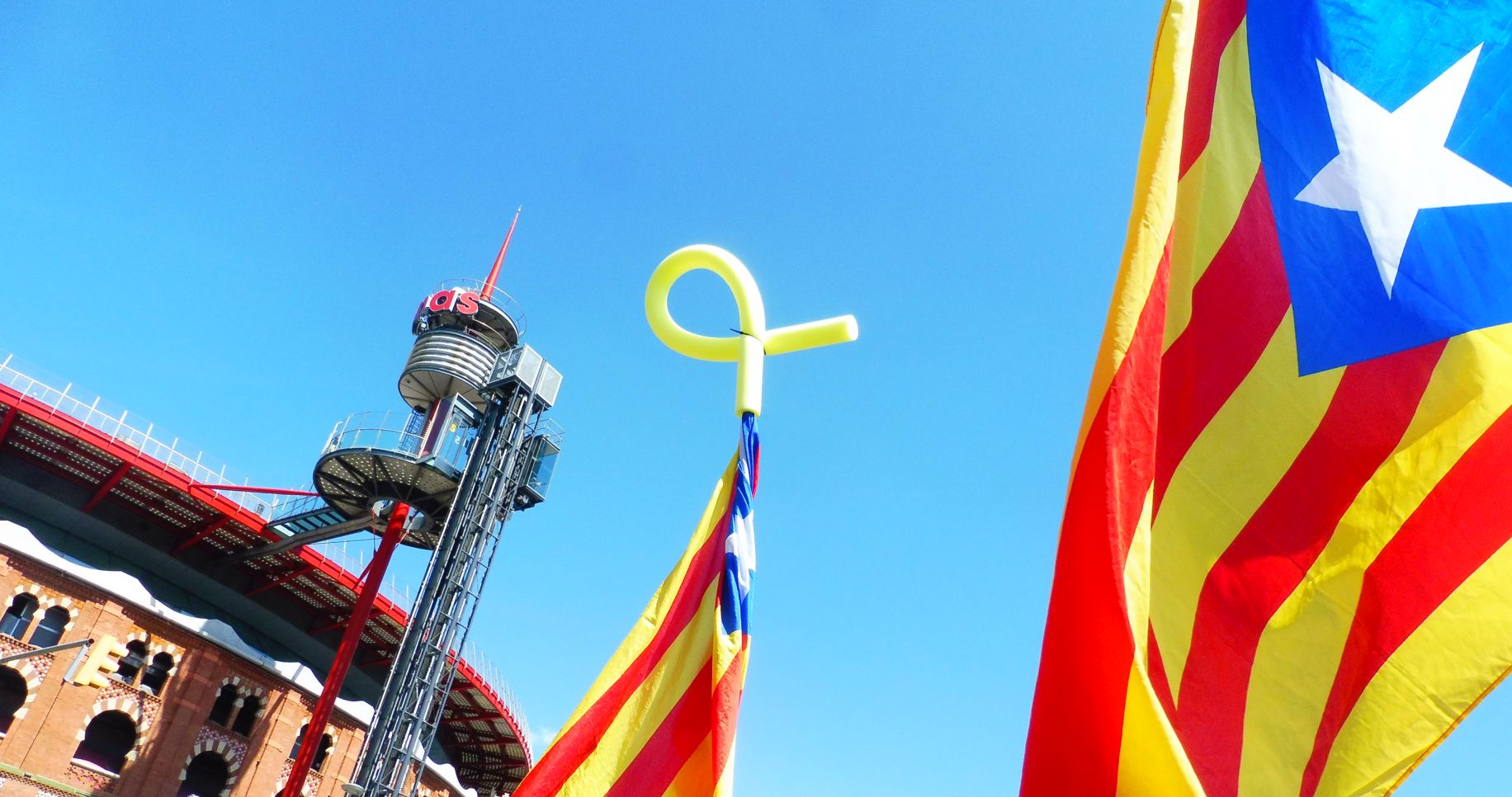 L’antiga plaça de braus, remodelada com a centre comercial, compartia amb estelades i llaços grocs.