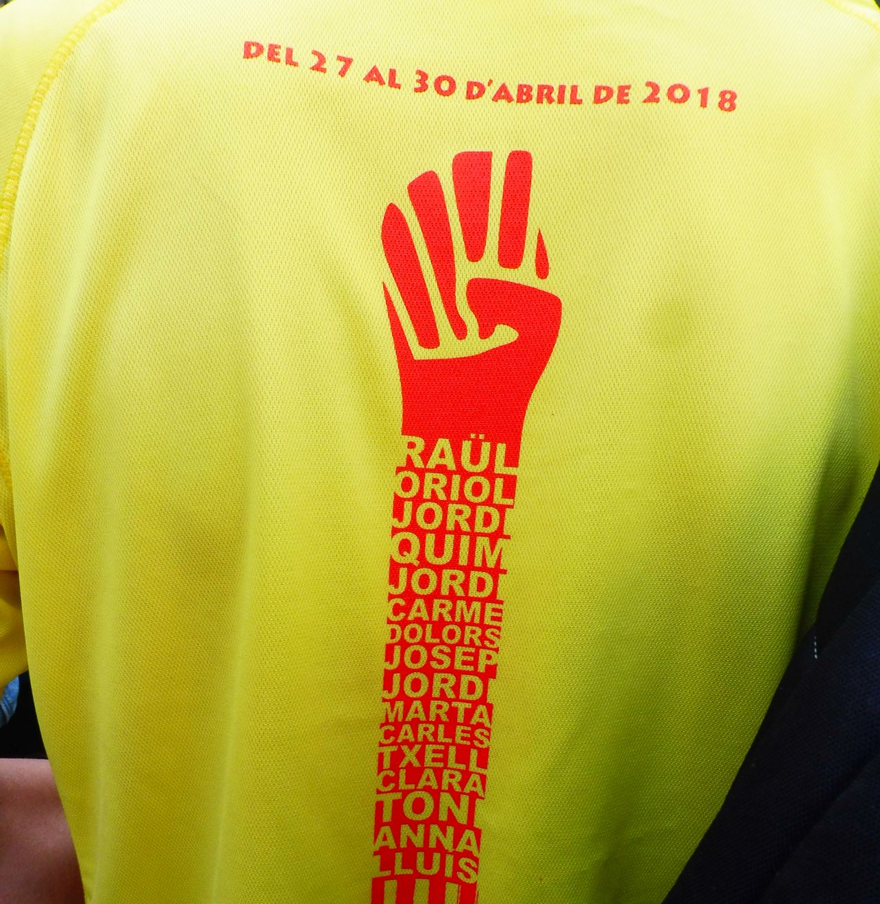 Al post anterior es veia la samarreta per davant. Aquí poseu veure el disseny que hi porta al darrera. el nom dels presos i preses i exilats i exilades.