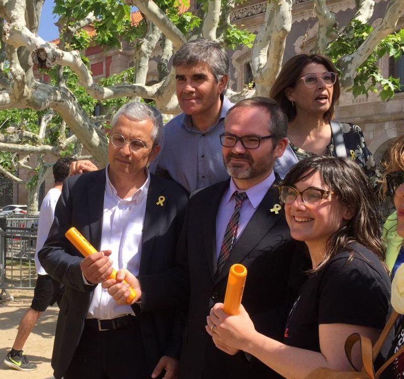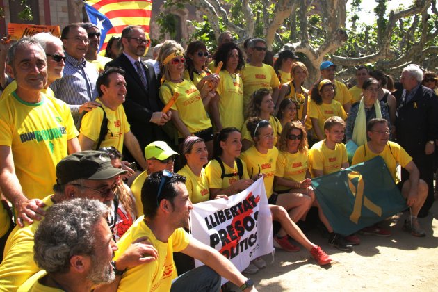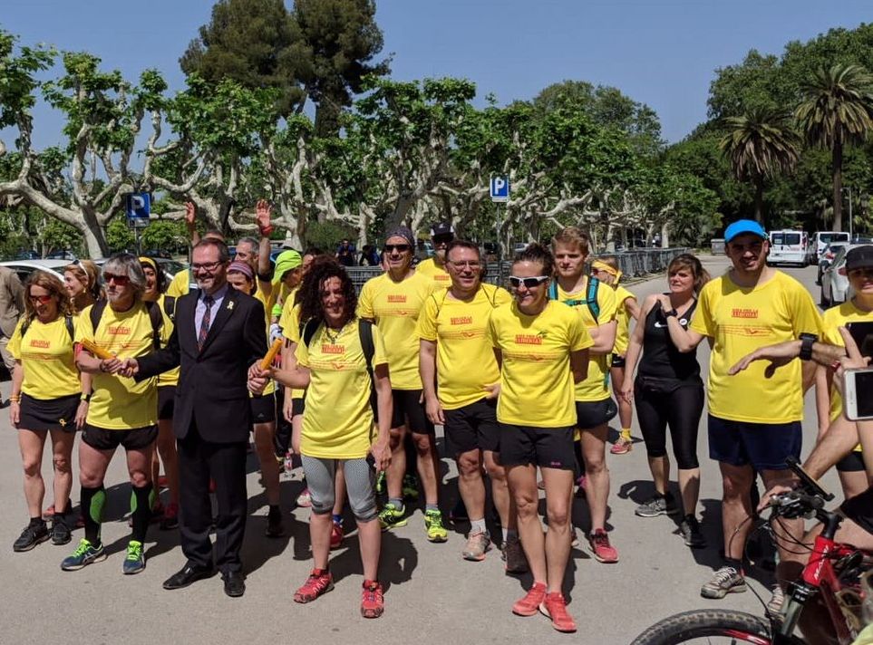 Fotografia de grup feta amb la gent que van córrer el primer tram i amb corredors/res d’altres trams que es van afegir a la presentació. Al centre, Josep Costa, porta a la mà el tub de color groc en el que hi ha escrit el seu nom i “Parlament de Catalunya” i que es passaran els relleus de l’un a l’altre fins arribar a l’últim grup de gent que corre..