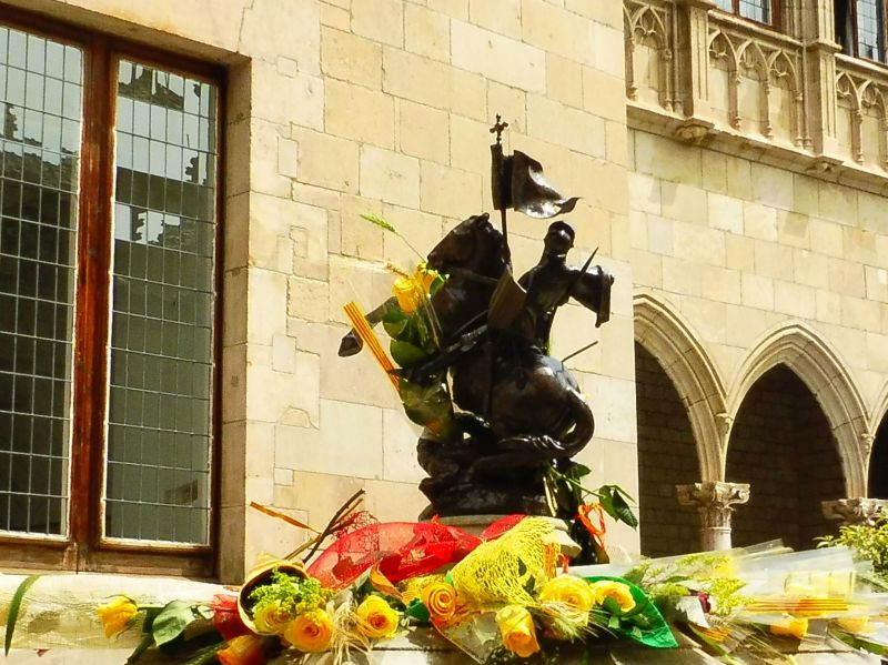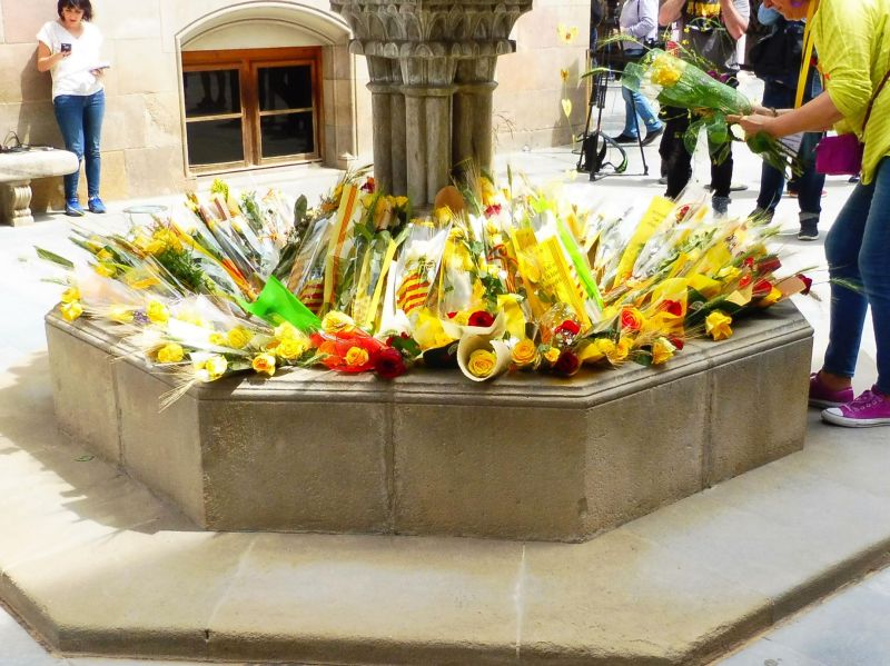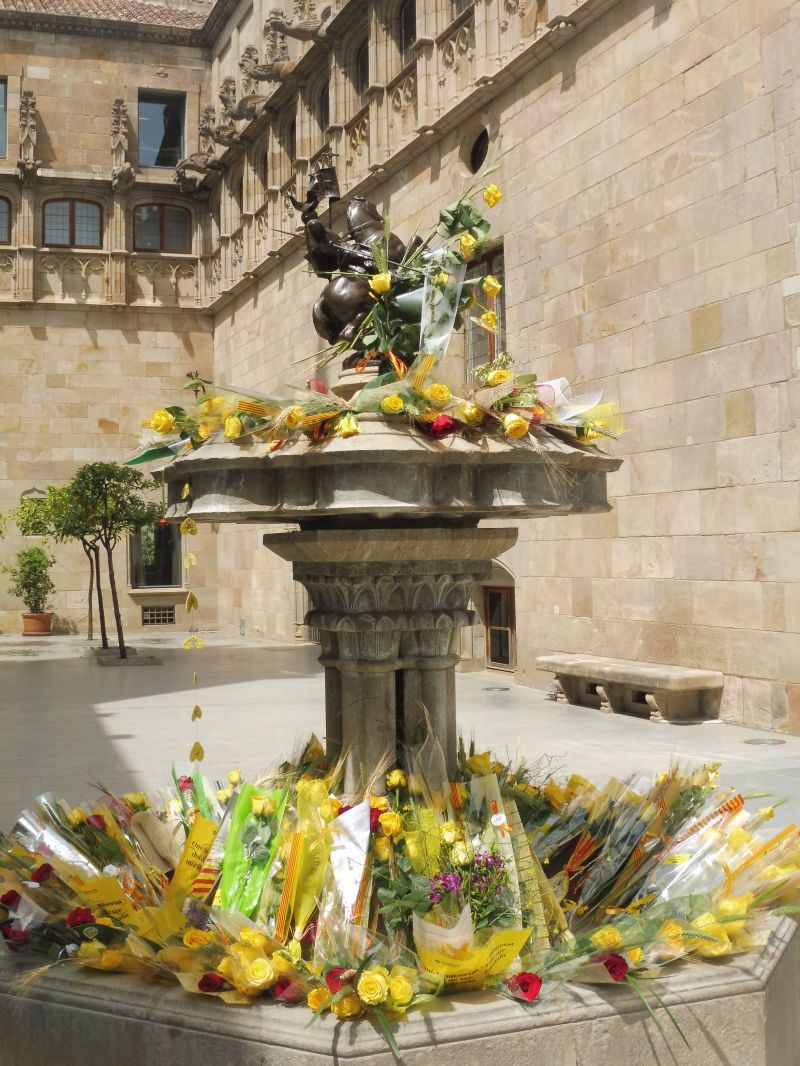 A la porta una parada de flors per si algú en vol comprar per fer una ofrena al monument dedicat a Sant Jordi que es troba al Pati dels Tarongers.
