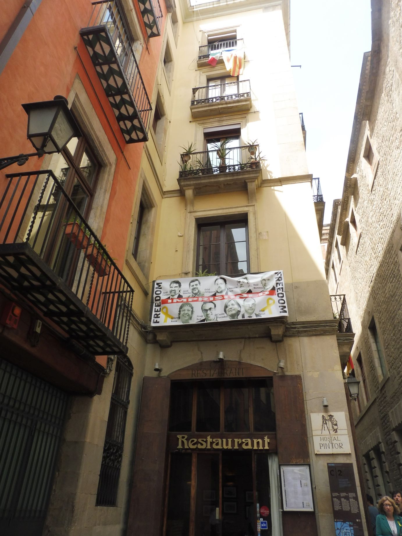 Va ser molta la gent que volia visitar el Palau en aquesta diada de Sant Jordi 2018 de manera que la cua era inacabable. Pels llocs on la cua anava avançant s’hi veien rètols i proclames a favor dels presos i preses polítiques i dels exiliats i exiliades.