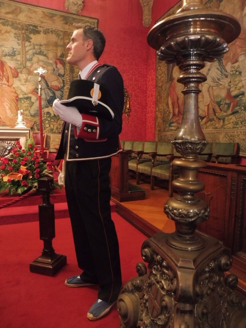 Un mosso d’esquadra vestit de gala resta dempeus dins l’exquisisa capella de Sant Jordi.