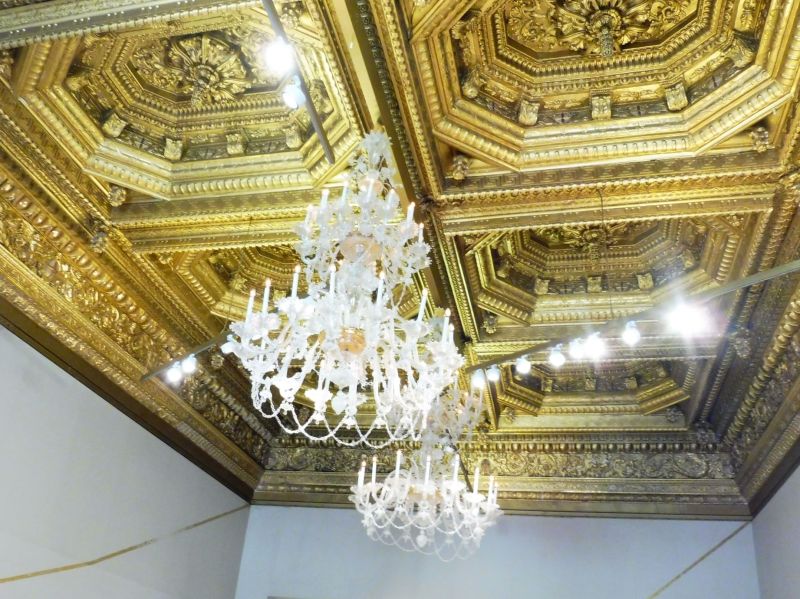 Entrem a la magnífica Sala Tarradellas que és la més magnificient de l’edifici per celebrar reunions del consistori, màxim òrgan de govern de la Generalitat. Hi destaca aquest espectacular sostre teginat daurat.