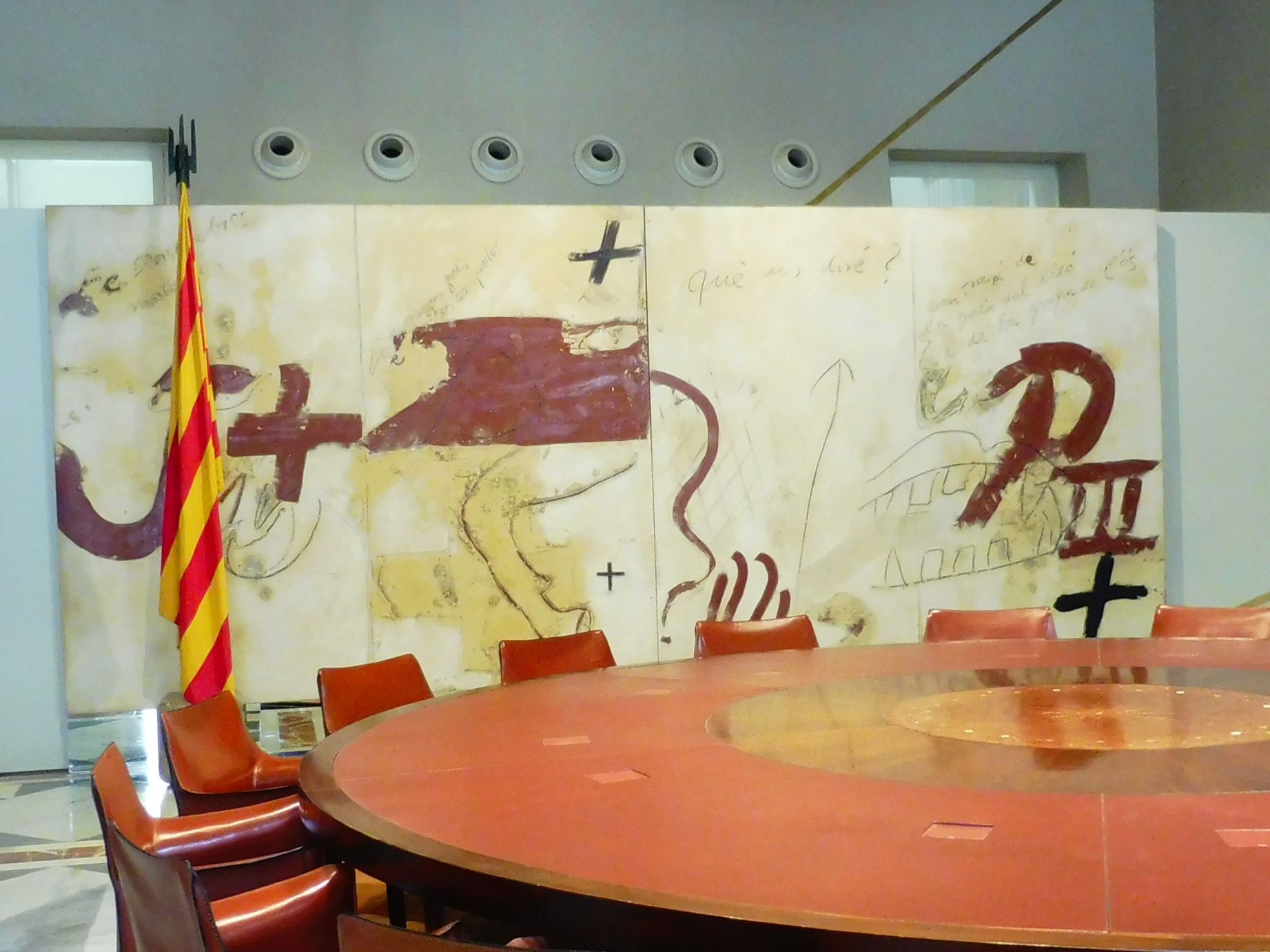 Un sostre que contrasta amb el mural d’Antoni Tàpies al·legoris de les Quatre Grans Cròniques medievals catalanes, i enllaça el passat històric amb la modernitat.