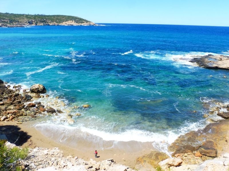 Fent camí en direcció cap el sud, el mar encara es mostra força mogut. Des de dalt, es veu la petita platja amb una sola persona que hi està ben ampla.