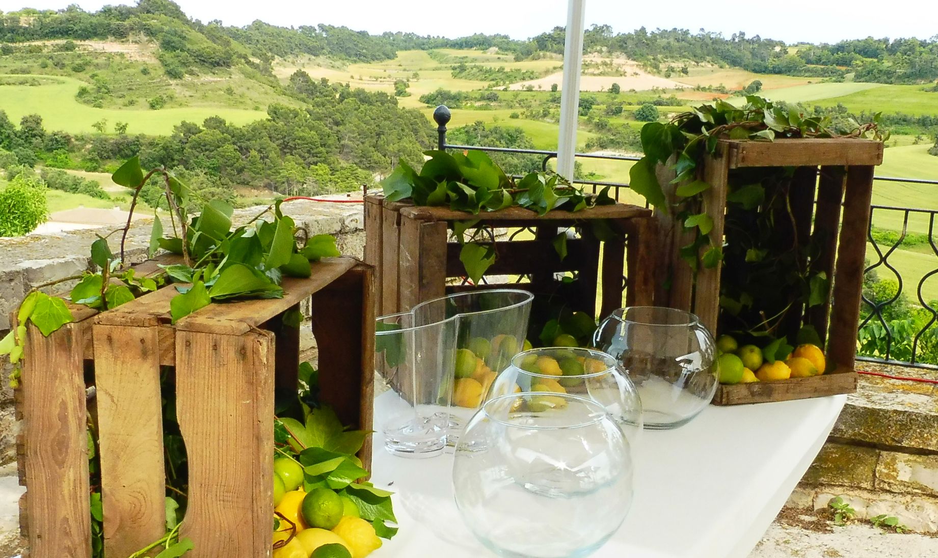 Bodegons fets amb caixes de fruita, recipients de vidre i llimones, tot lligat am l’heura quedaven ben integrats amb els camps verds del fons.