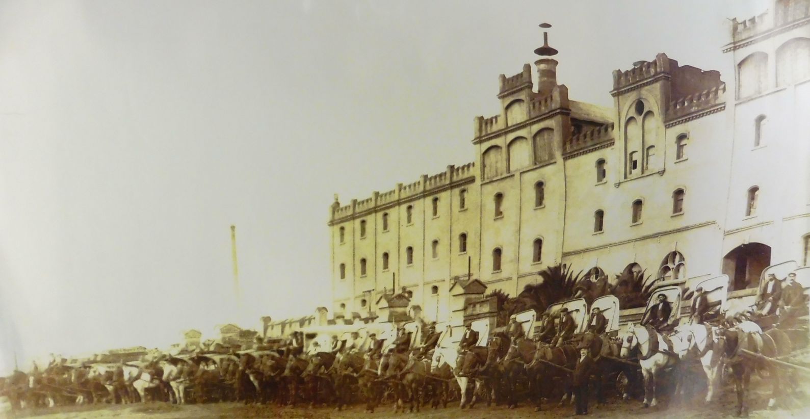 Crida l’atenció veure aquesta imatge en la que sembla que els repartidors formen davant la fàbrica amb els seus carros de transport menats per cavalls.