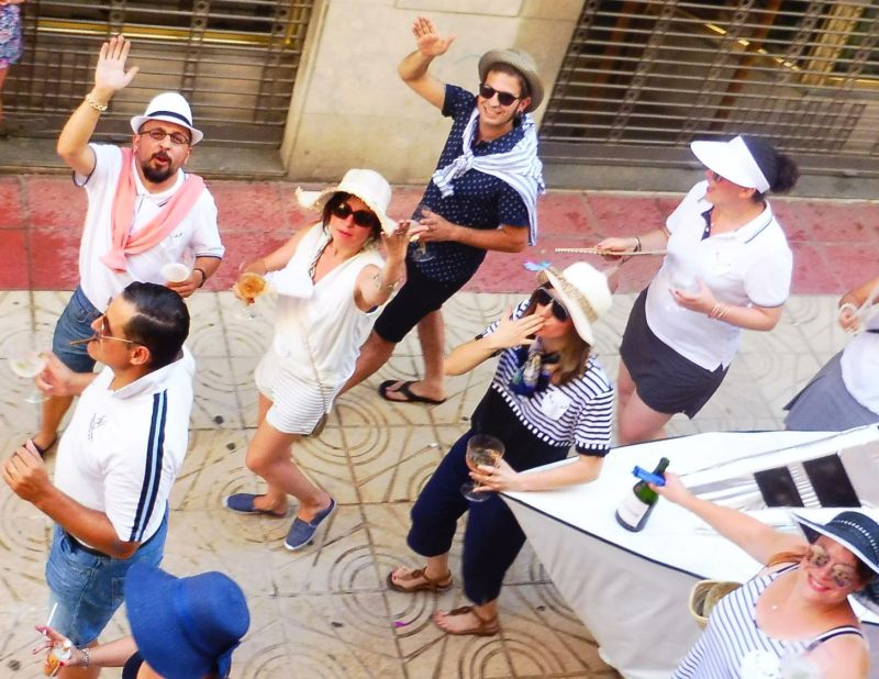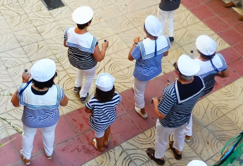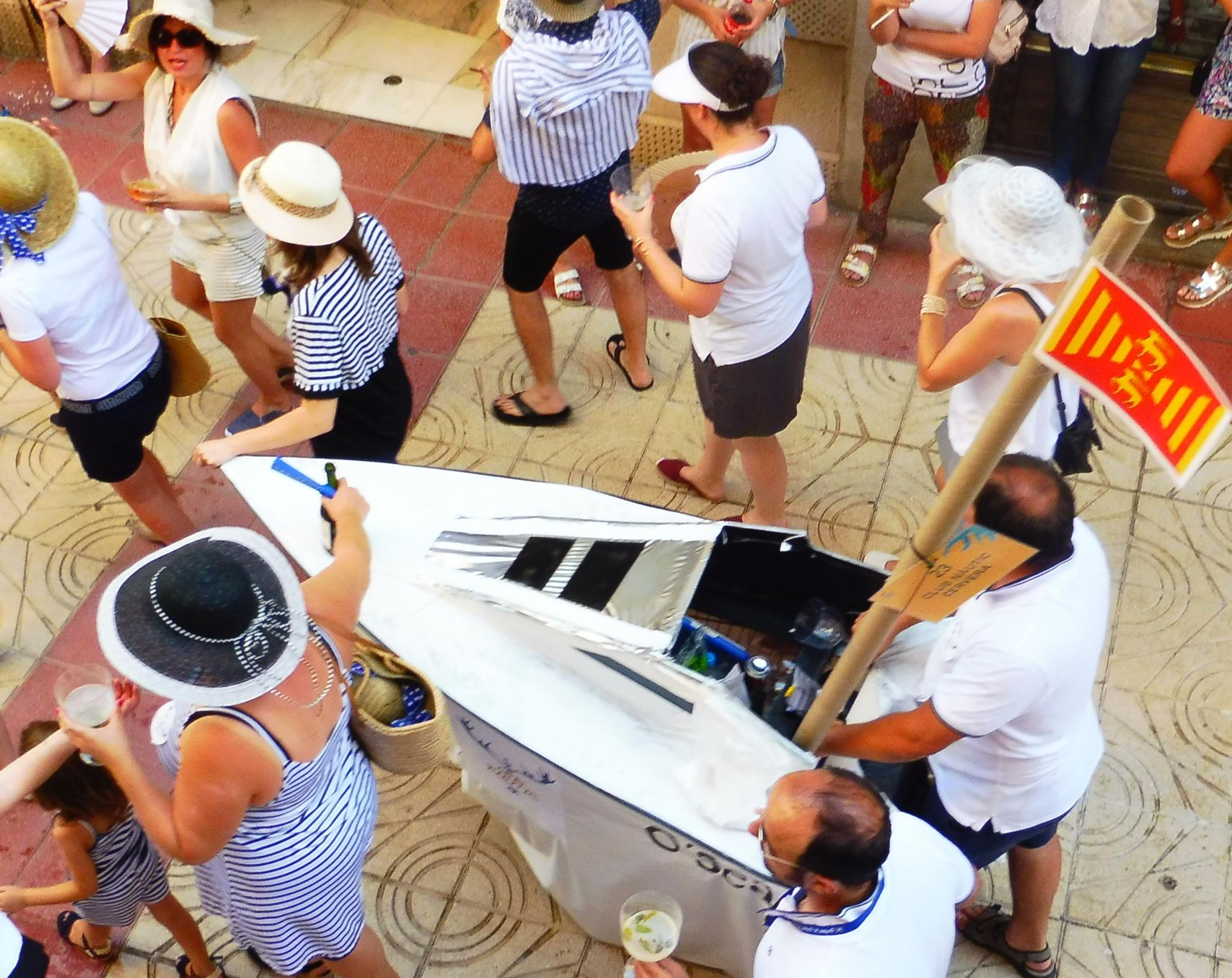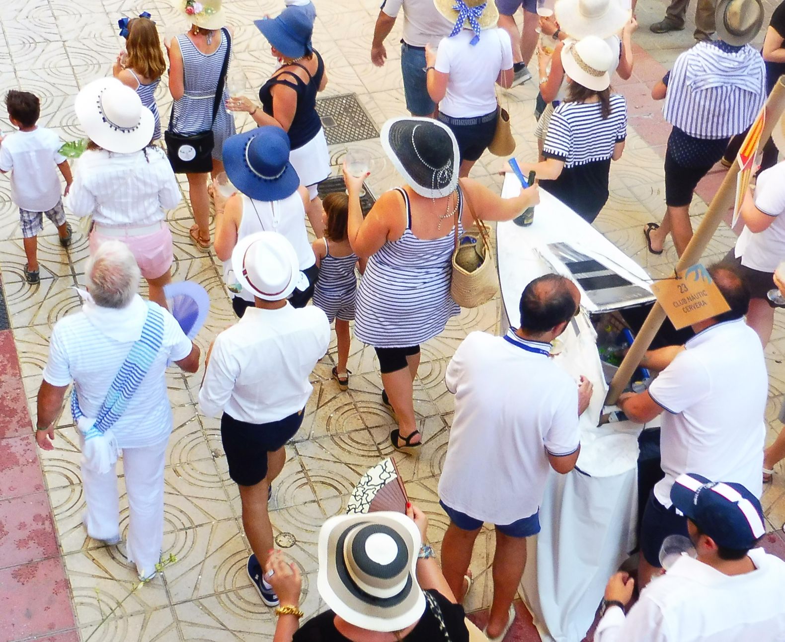 Aquesta colla que no vèim mai en plan “pijo” donaven una lliçó amb el seus combinats blancs i blaus. Costava molt identificar un clenxinat Ferran Orobitg, de Fadunito, a l’esquerra, amb aquestes maneres tan del PP. La comparsa es presentaven com a “Club Nàutic de Cervera”.