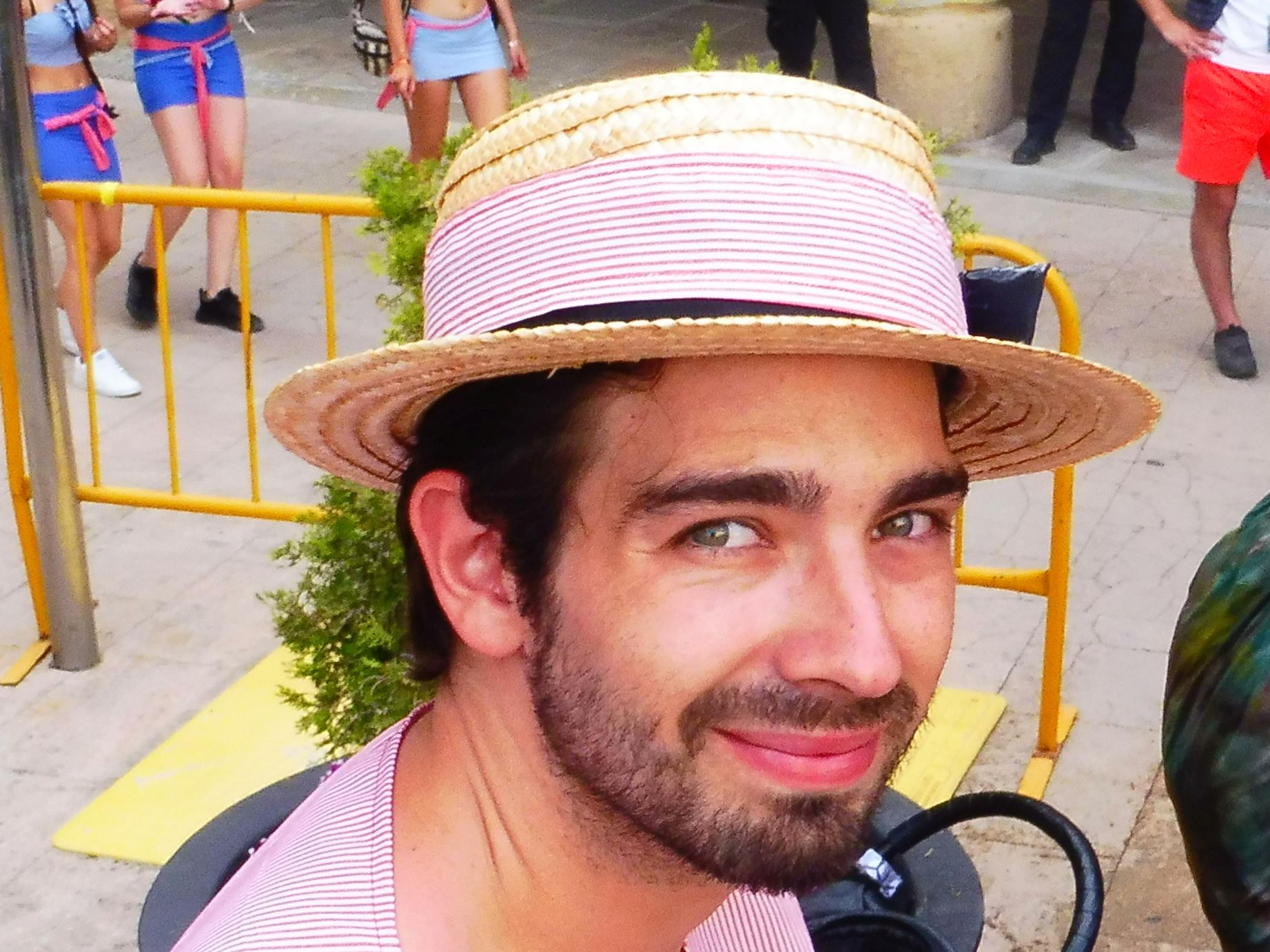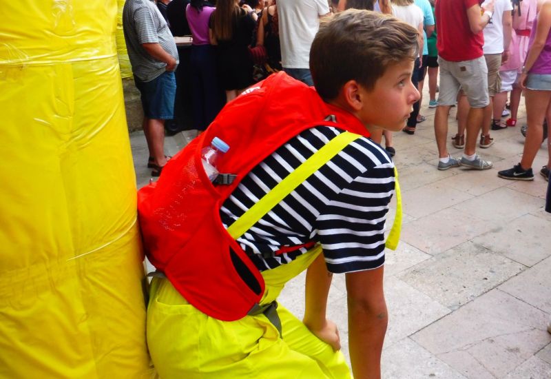 La plaça es mostra amb totes les columnes i altres elements folrats de groc. Aquesta pilastra s’adiu amb la vestimenta d’aquest jovenet que fa un descans, recolzant-s’hi.