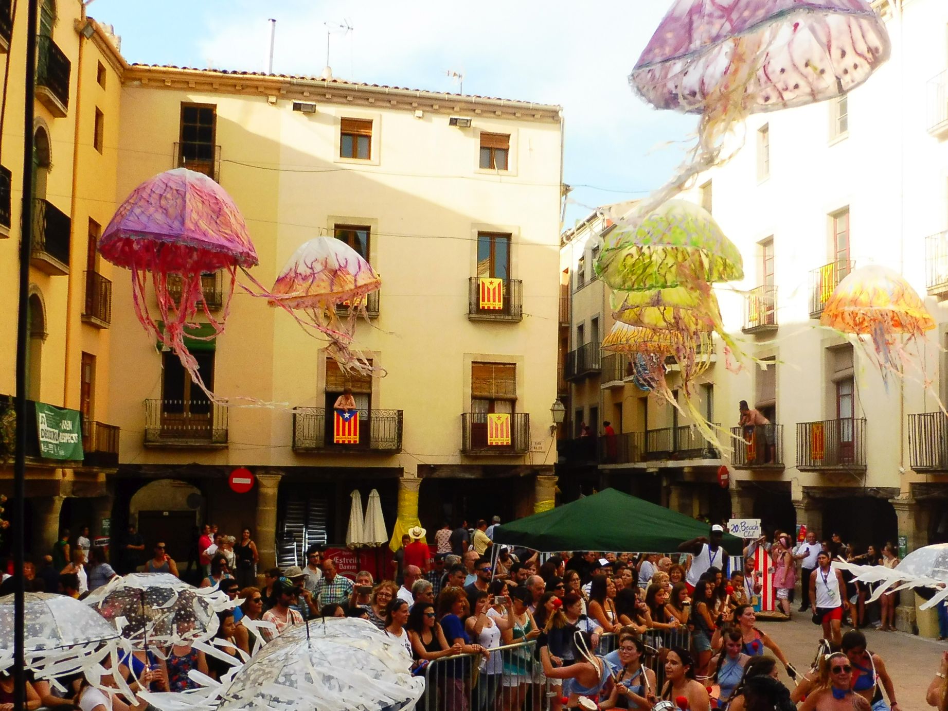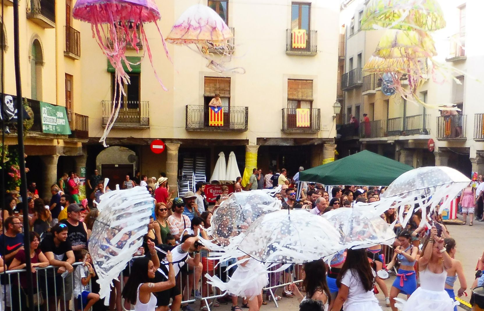 “La Segarrense” encara va traginant el seu peix fresc, amb balança inclosa, en aquesta parada que demana “Llibertat pels peixos polítics” L’humor no ho por faltar en una festa com aquesta.