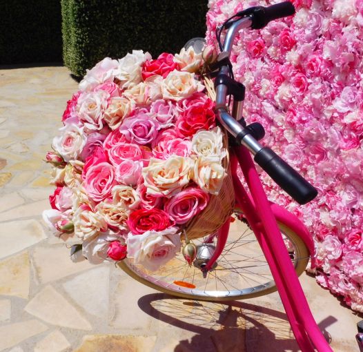 La bicicleta que hi té al davant és molt bonica. Rosa i amb un cistell ple de roses rosa, no pot ser més cool.