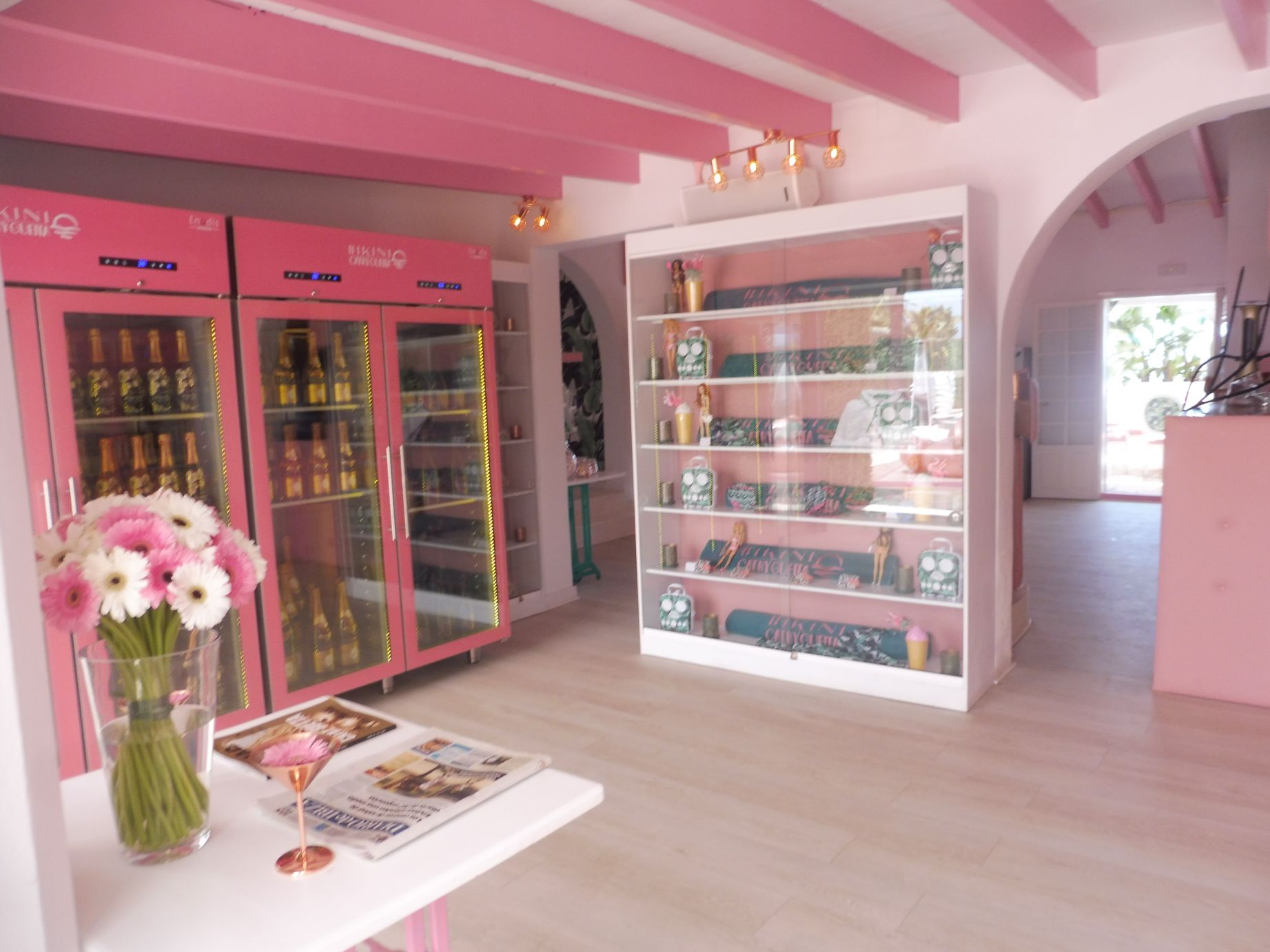 El rosa segueix sent el protagonista. Les antigues bigues d’aquest remodelat espai queden ideals pintades d’aquest to xiclet. A l’expositor hi ha alguns objectes que formen part de la decoració. Són còpies que estan a la venda