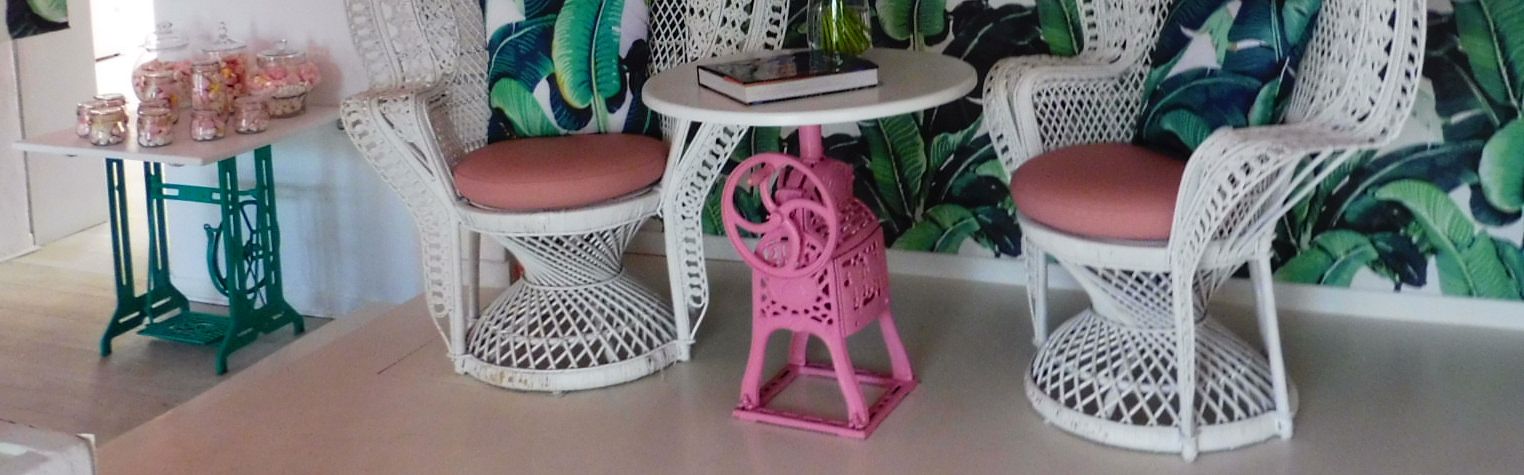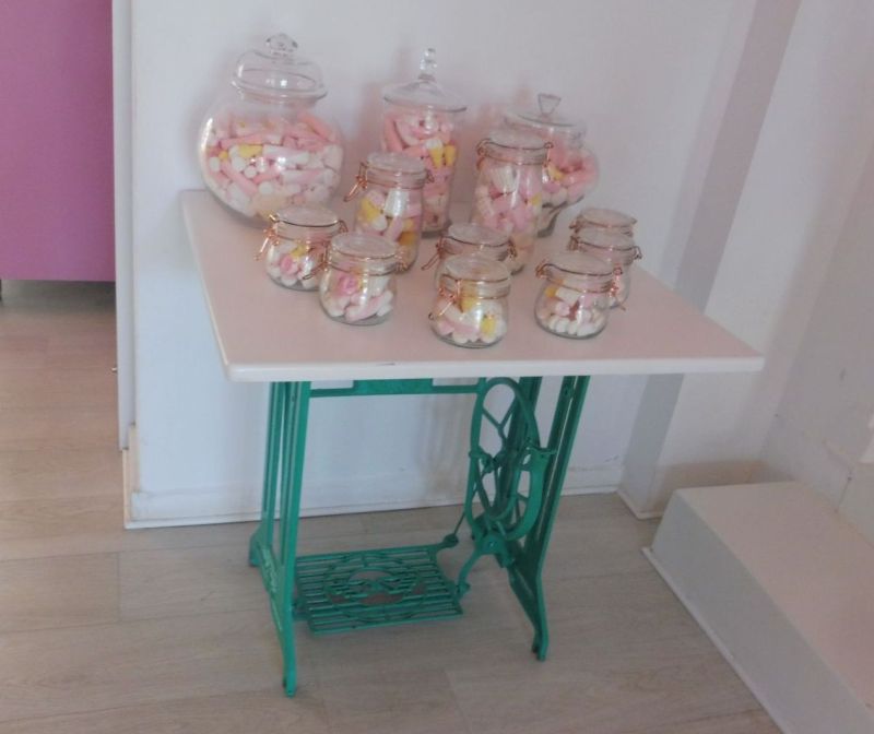 Taules fetes amb peus de màquines de cosir Singer pintades amb color verd turquesa que, junt amb el rosa, és el dominant en tota la decoració. Aquests pots de vidre plens de llaminadures, flonges i roses, resulten molt “sweet”.