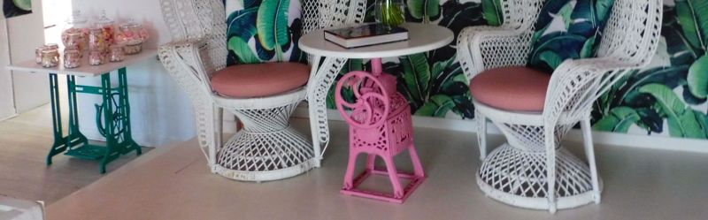 A l’esquerra tormen a veure aquesta màquina de cosir i, a continuació, una gran cadira de mimbre que, junt amb altres, fa racons per prendre alguna beguda fent la funció d’espai bar o també sala de té.