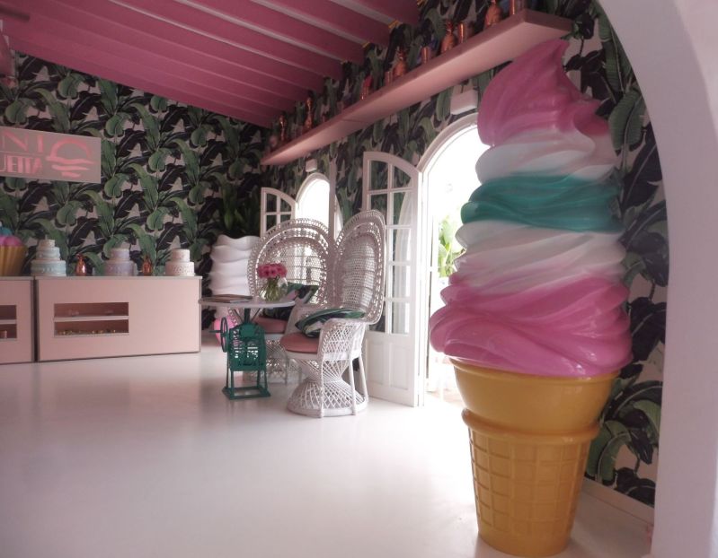 Un gegantí cucurutxo amb diferents capes de gelats embelleix aquest racó.
