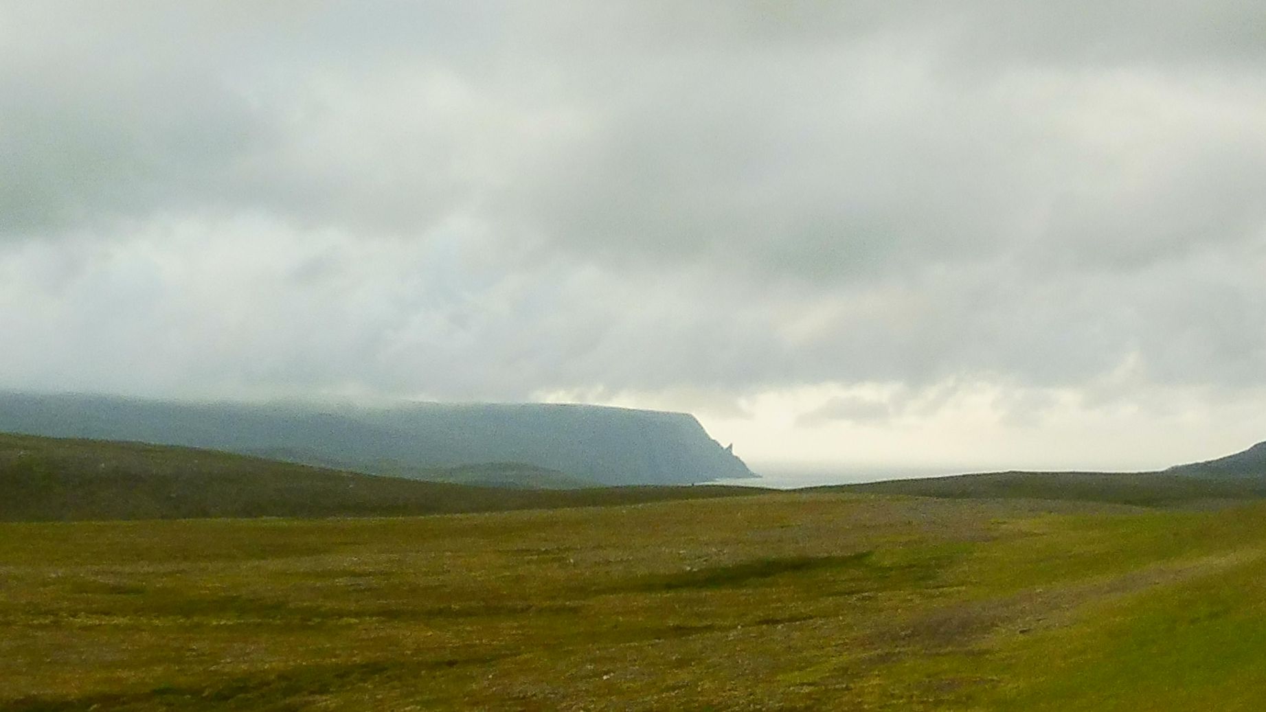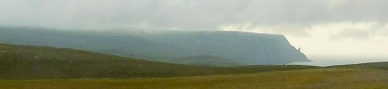 Ja queda poc per arribar al lloc mític: Cap Nord, que ja es veu al fons. S’hi pot veure bé el corn que hi surt de l’acantilat. Aquest acantilat marca la fi del món. És una paret d’uns 300 metres que cau en picat fins el mar.
