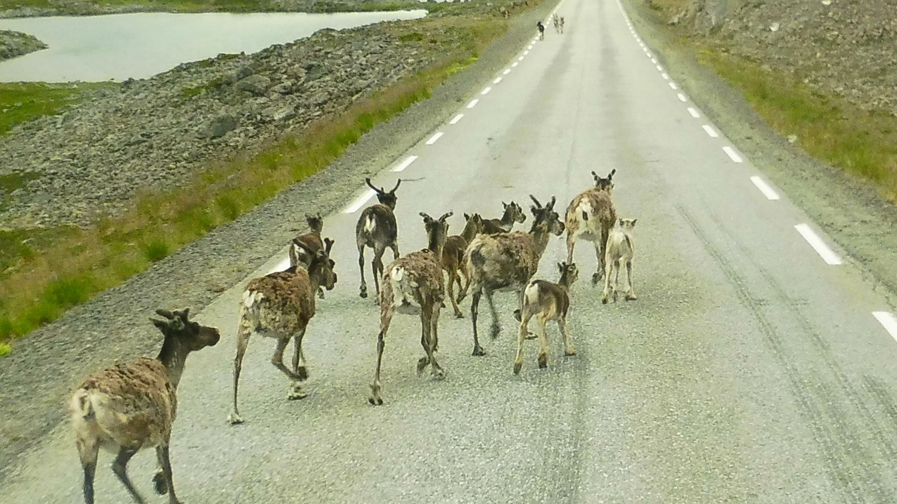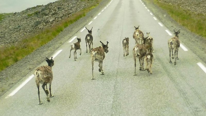 Els rens segueixen el seu camí transitant per les carreteres. Observeu el seu cos com que es veu com tacat degut a la pèrdua de pèl.