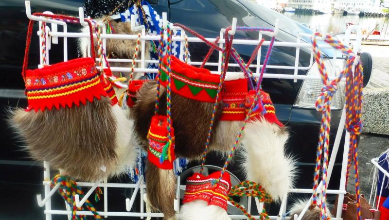 Els samis, en aquests cas noruecs, fan molts objectes d’artesania que venen en parades al carrer. Aquests bolsets estan fets amb pell de ren.