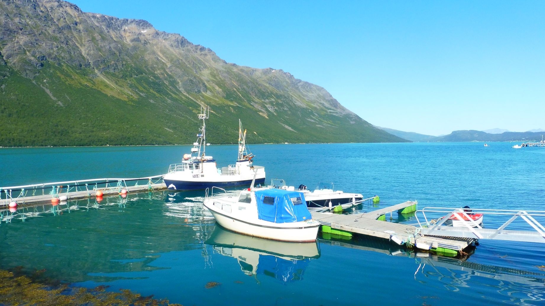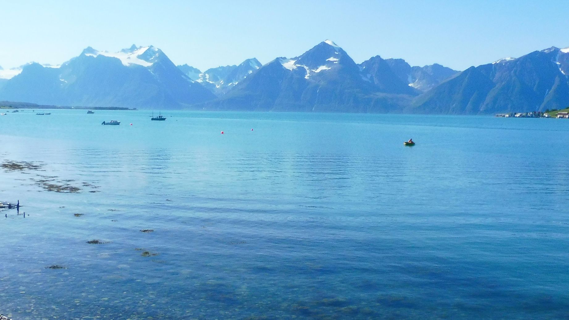 El dia segueix sent fantàstic i el color de les aigües d’un preciós blau. El fiord de Lyngen està vorejat de muntanyes que agafen alçada al seu costat i s’aixequen fins quasi els dos mil metres. S’hi poden veure glaceres, a l’esquera se n’aprecia una, i neus perpètues…cada vegada menys degut al canvi climàtic.