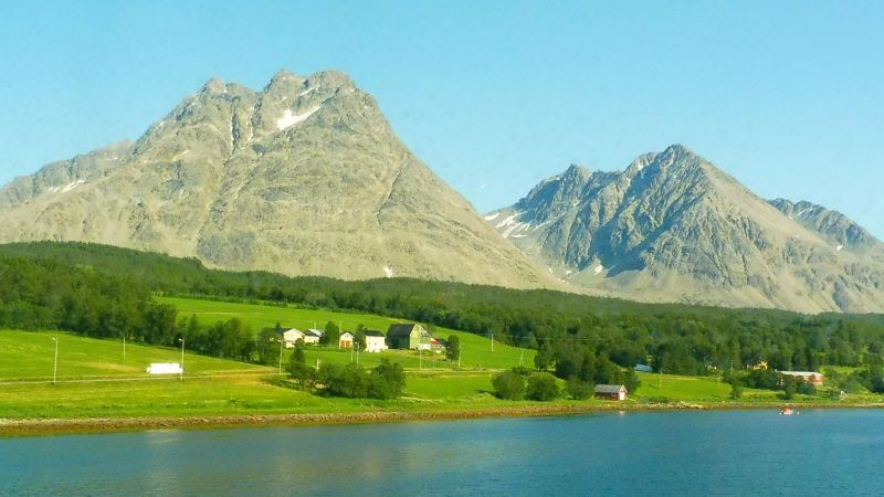 El perfil de les muntanyes, junt amb el petit pla que hi ha a la riba del fiord i, el blau de les seves aigües, fan que l’estampa que es contempla sigui de postal