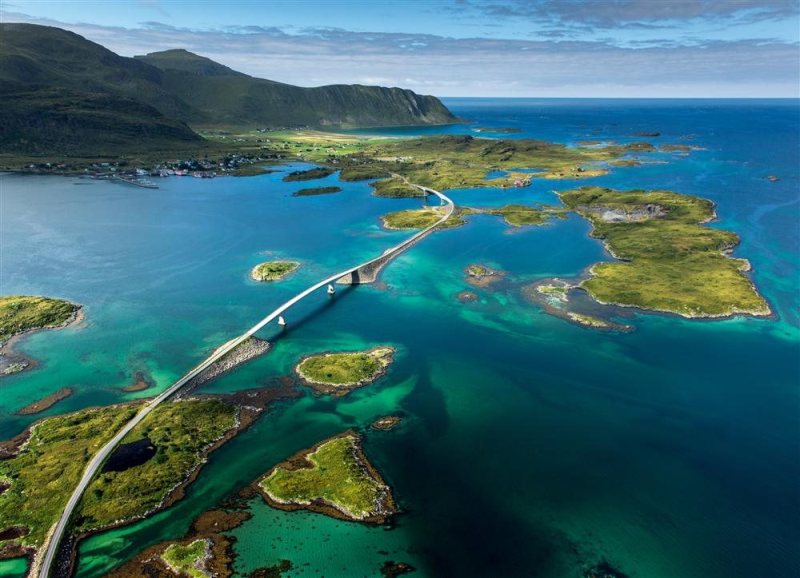 En aquesta fotografia, manllevada, es pot veure una part de la carretera que uneix totes les illes, de manera que s’hi pot transitar amb cotxe, circulant per damunt de les aigües de diferents fiords.
