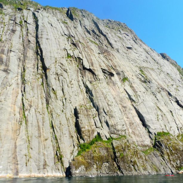 Unes parets, quasi verticals, s’aixequen a ambdues bandes en un tram del fiord.