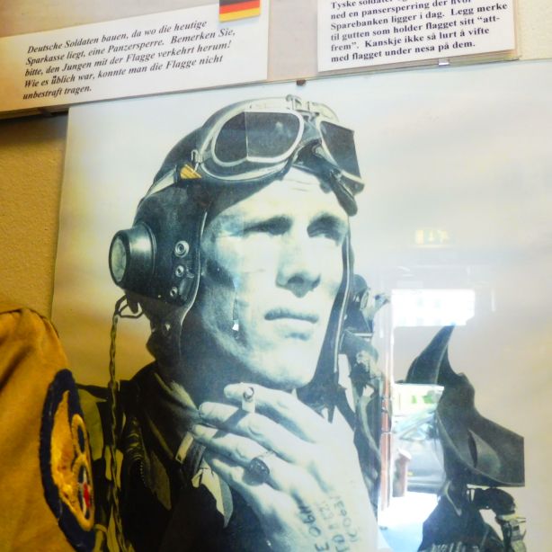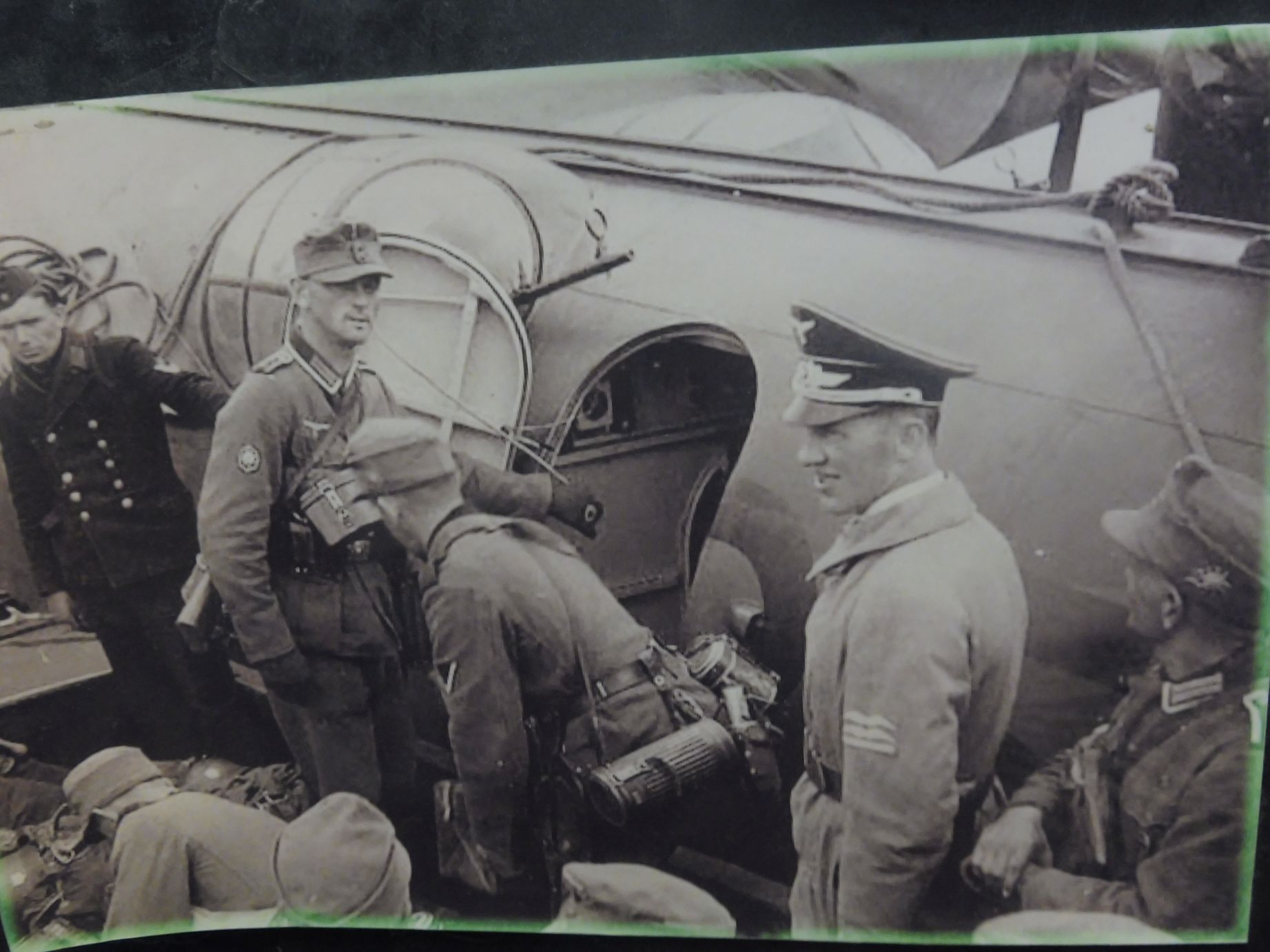 Aquest jove va vestit com els soldats que es veuen a la imatge real del temps de guerra, que es veu al darrera.