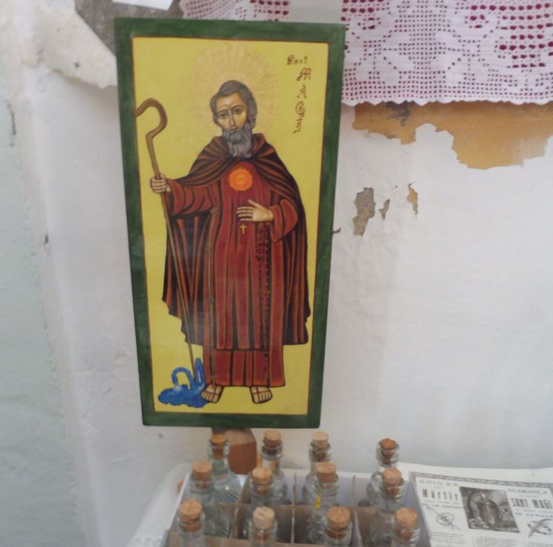 Un altra en format pintura presideix un conjunt d’ampolletes que contenen l’aigua miraculosa de la Brufaganya.