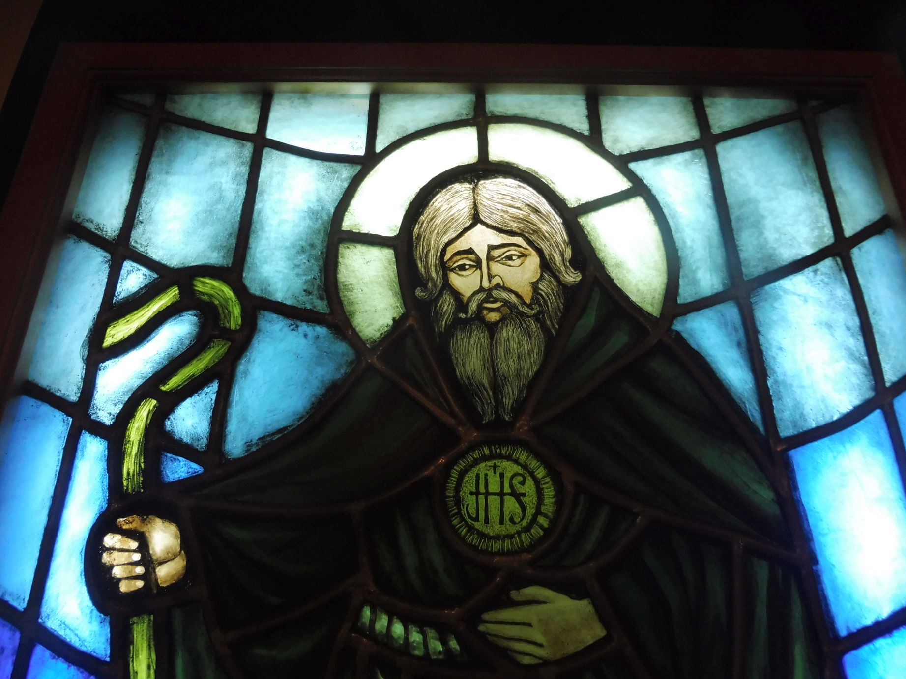 Sant Magí escenificat en un vitrall que, il·luminat per darrera, fa que la figura hi destaqui molt bé.