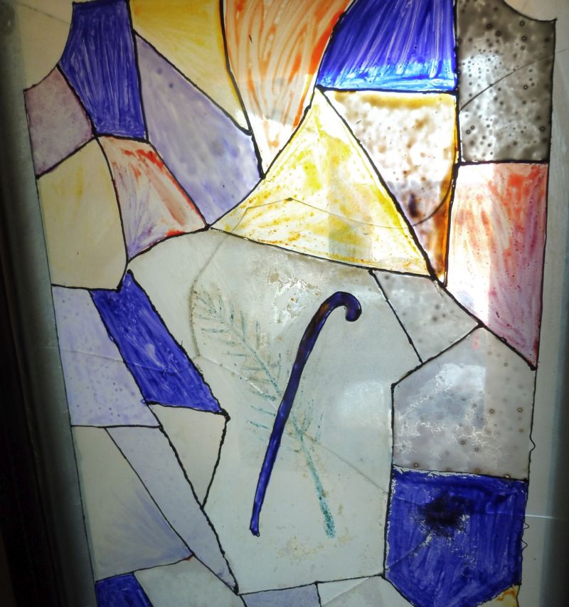 S’aprofita el vidre d’una finestra de l’escala per embellir-lo amb dibuixos i convertir-lo en un senzill vitrall.